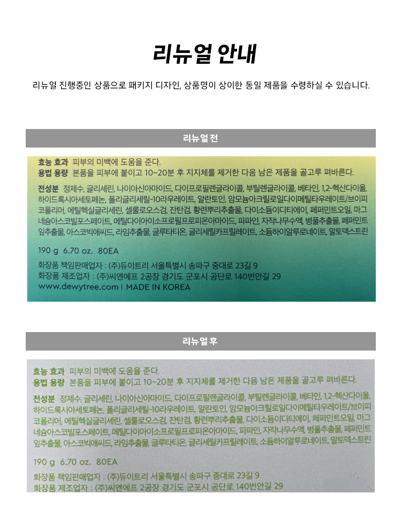 | 화장품제조업자, 화장품책임판매업자 및 맞춤형화장품판매업자 | 컨텐츠 참조 | 제조국 | 대한민국 |