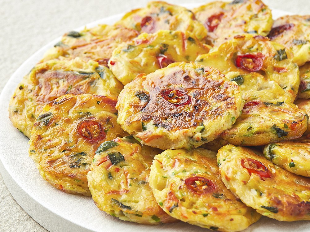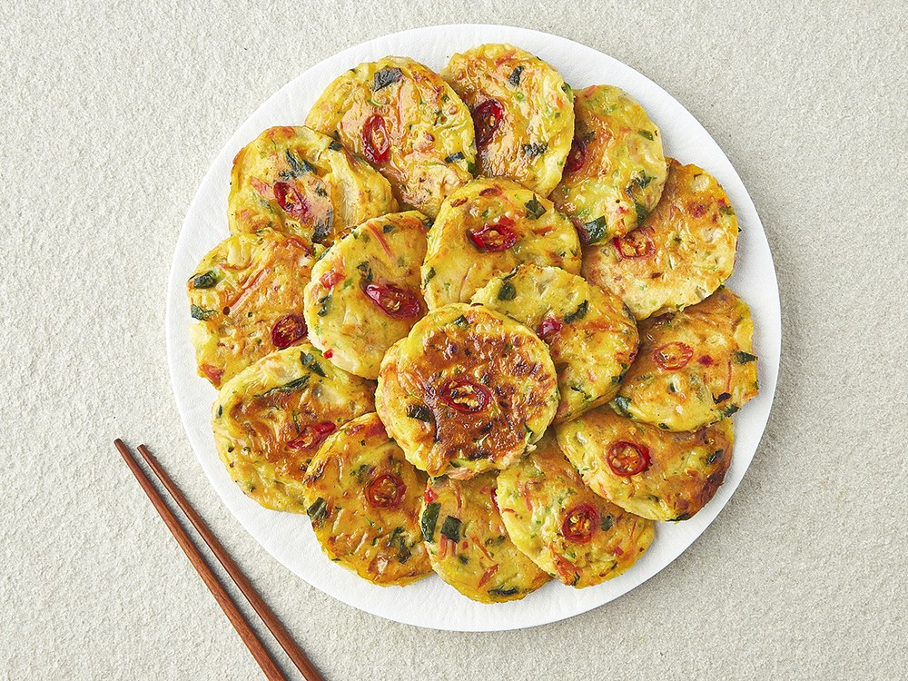 프라이팬에 굽기만 하면 완성되는 깻잎애호박전이에요. 동글동글 앙증맞아 깔끔하게 드시기 좋은데요. 한입 먹어보면 향긋한 깻잎과, 부드러운 애호박의 조화를 만끽할 수 있답니다. 차례상에 올려도 손색없고, 일상에서 즐기는 밥반찬으로도 좋아요.