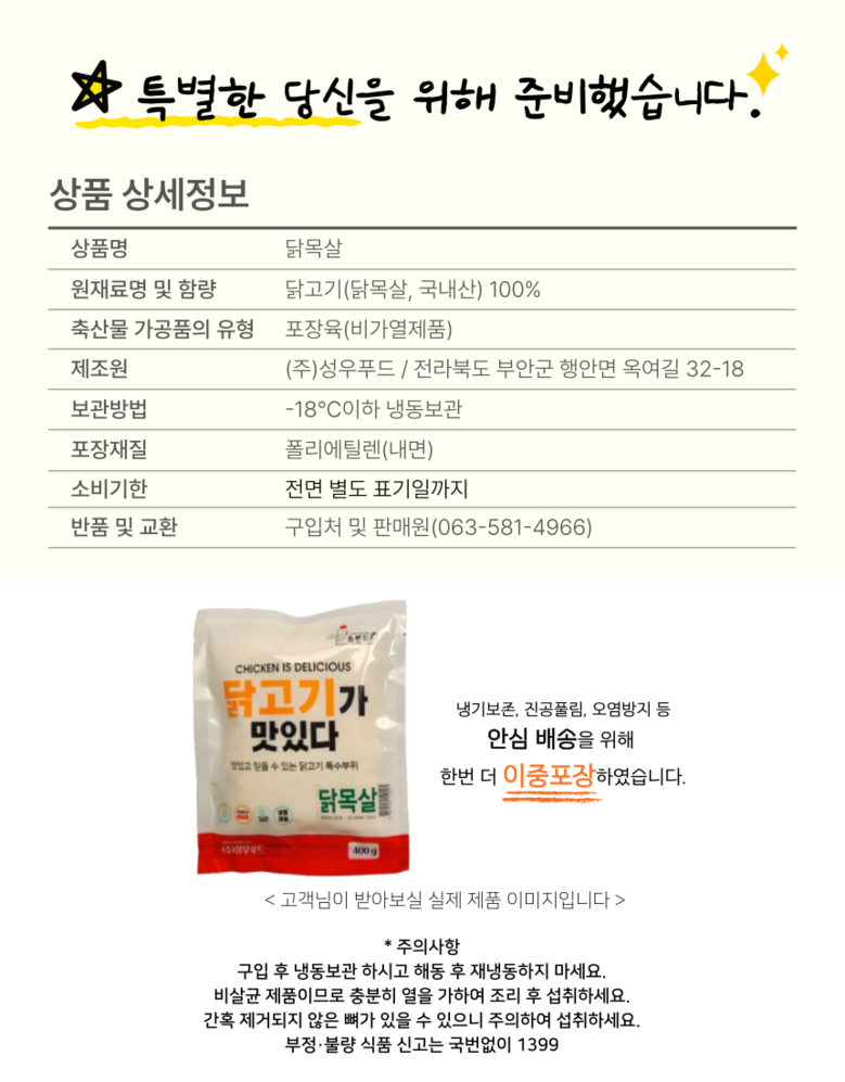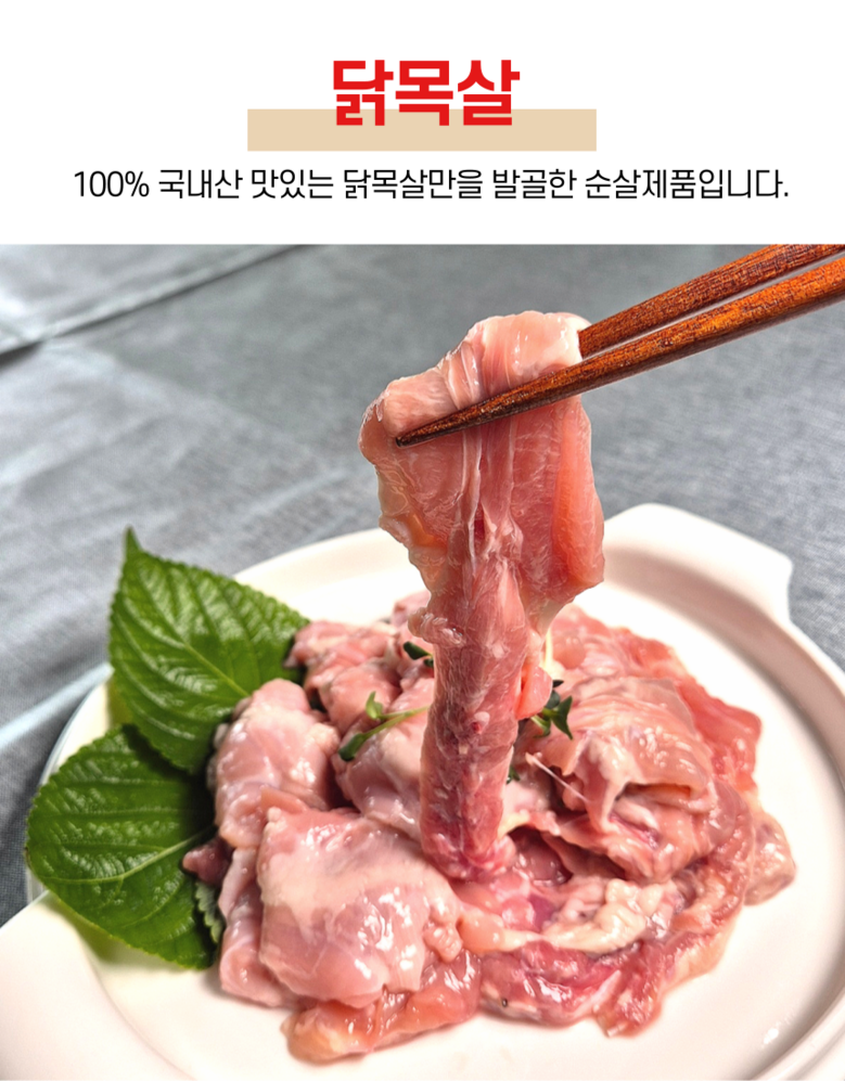 | 품목 또는 명칭 | 닭목살 | 포장단위별 내용물의 용량(중량),수량,크기 | 1kg |