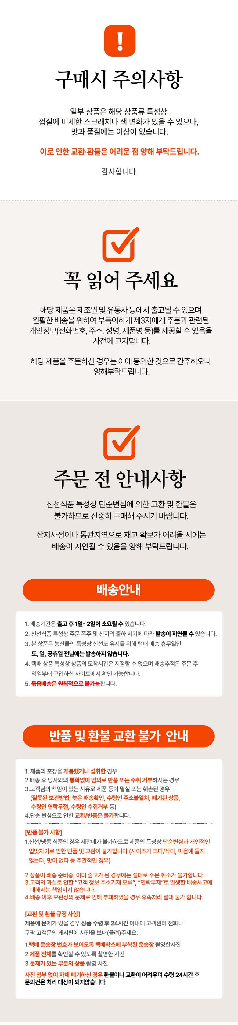 | 배송방법 | 신선/냉장/냉동 | 배송비 | 무료배송 · 도서산간 추가 배송비 - 제주 지역: 4,000원 - 도서산간 지역: 4,000원 |