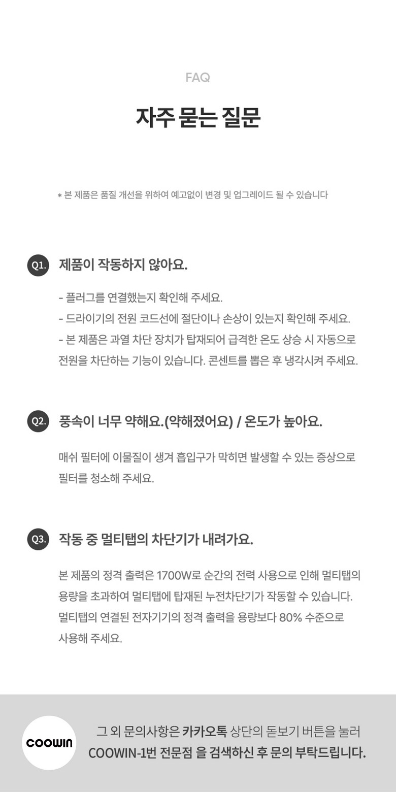 - 가격, 판매자, 교환/환불 및 배송 등 해당 상품 자체와 관련 없는 문의는 고객센터 내 1:1 문의하기를 이용해주세요.