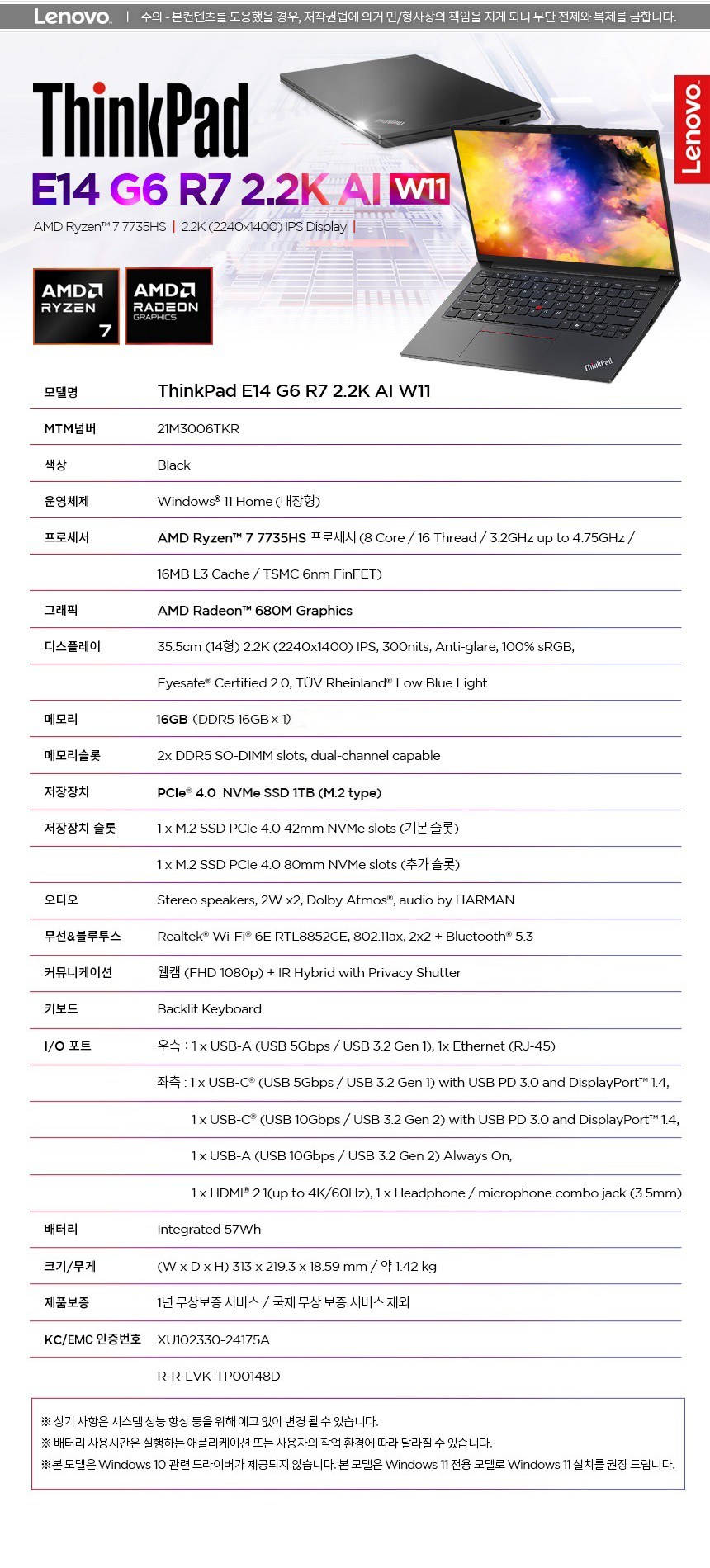 | 품명 및 모델명 | 노트북 / Thinkpad E14 G6 R7 2.2K AI (TP00148D, ThinkPad E14 gen 6) | KC 인증정보 | XU102330-24175A, R-R-LVK-TP00148D |
