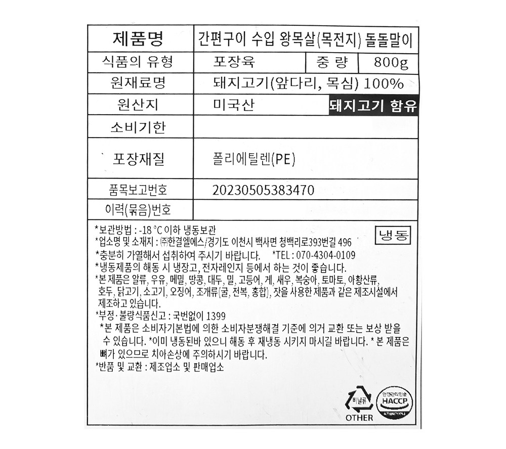 | 제조연월일, 소비기한 또는 품질유지기한 | 소비기한(또는 유통기한) : 2026년 10월 08일 이거나 그 이후인 상품<br />제조년월일 : 2025년 10월 09일 이후인 제조상품 | 세부 품목군별 표시사항 | 축산물 등급표시 : 해당 없음 / 이력번호 표시유무 : 이력번호 표시제품임 |