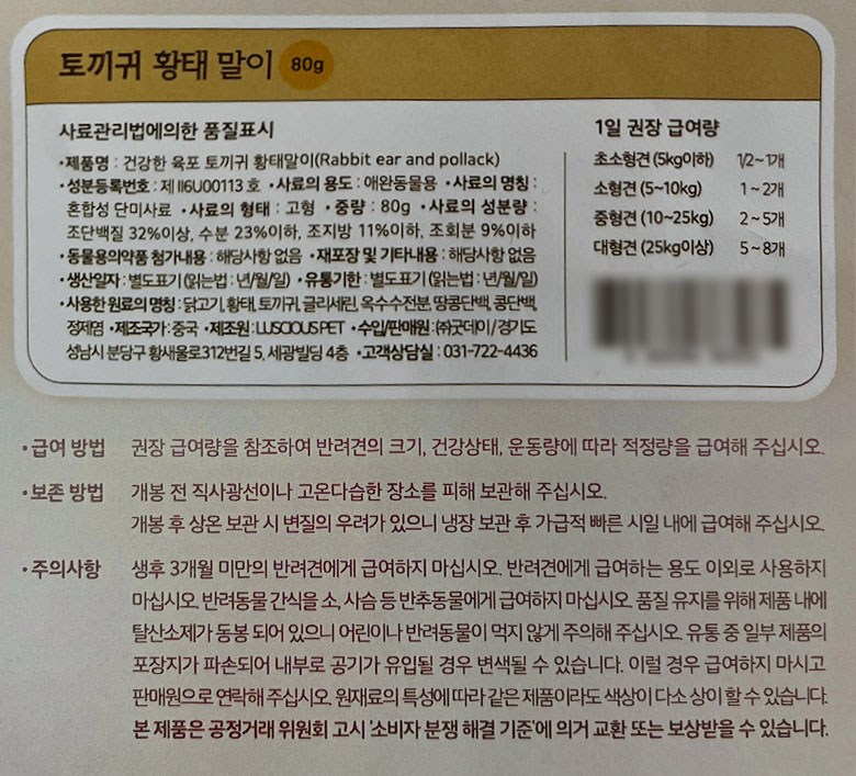| 품명 및 모델명 | 건강한 육포 토끼귀 황태말이(Rabbit ear and pollack) | 인증사항 | 사료관리법에 따른 성분등록번호 : 컨텐츠 참조 |