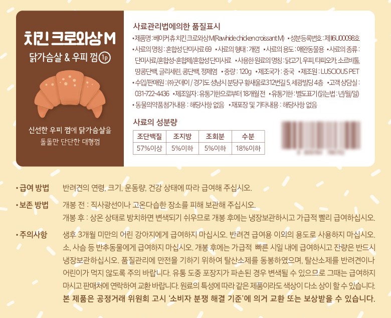 | 품명 및 모델명 | 치킨 크로와상 M | 인증/허가 사항 | 사료관리법에 따른 성분등록번호 : 컨텐츠 참조 |