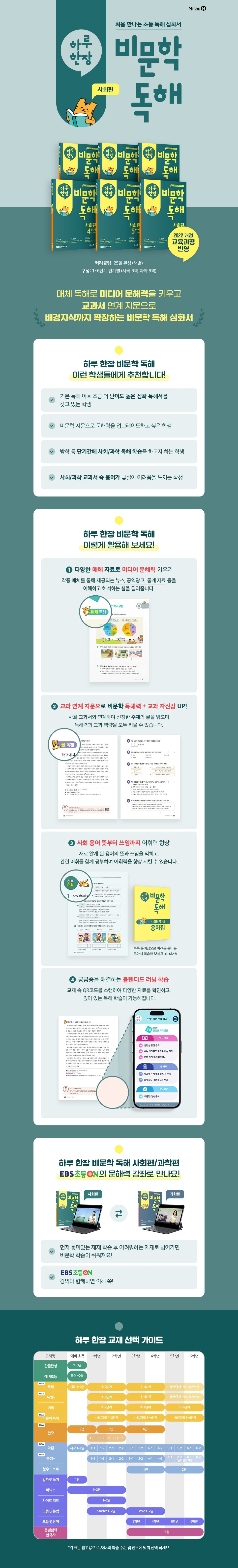 미디어 문해력이 중요해진 시대 매체가 제공하는 다양한 정보를 해석하고 이해하는 능력이 바로 미디어 문해력입니다. 오늘날 우리 아이들의 언어 환경은 매체와 분리해서는 생각할 수 없죠. 교육과정에서도 지속적으로 매체 이해를 중요시하고 있으며, 2022 수능부터는 국어영역의 선택과목으로 ‘언어와 매체’가 신설되기도 하였습니다. 글뿐만 아니라 영상, 사진, 그래프 등을 함께 이해하고 수용하는 능력이 그 어느때보다 필요한 시대를 살아가고 있습니다. 하루한장 비문학 독해에서는 일상생활에서 접할 수 있는 다양한 매체 속 자료들을 제공하고 이를 해석하고 이해하는 힘을 키울 수 있도록 하였습니다. 핵심을 뽑아내는 것이 경쟁력인 시대 중요한 글을 읽고도 핵심이 무엇인지 몰라 즉각적인 조치를 취하지 않거나 실행하지 않아 낭패를 보는 경우가 있습니다. 눈으로 글자를 읽었을 뿐 제대로 독해하지 않았기 때문에 벌어지는 일입니다. 학년이 올라갈수록 딱딱하고 긴 글을 마주해야 합니다. 글을 구조화하며 읽고, 분석적으로 이해하지 않으면 몇 시간씩 공부를 해도 절대 실력이 쌓이지 않습니다. 하루한장 비문학 독해에서는 세부 내용 확인하기, 중심 내용 찾기, 제목 정하기 등의 문제를 통해 글의 핵심을 파악하는 힘을 키울 수 있도록 하였습니다. 아울러 의견 나누기, 미루어 짐작하기, 다른 사례에 적용하기 등의 문제를 통해 확장하여 생각하는 힘도 키울 수 있습니다.
