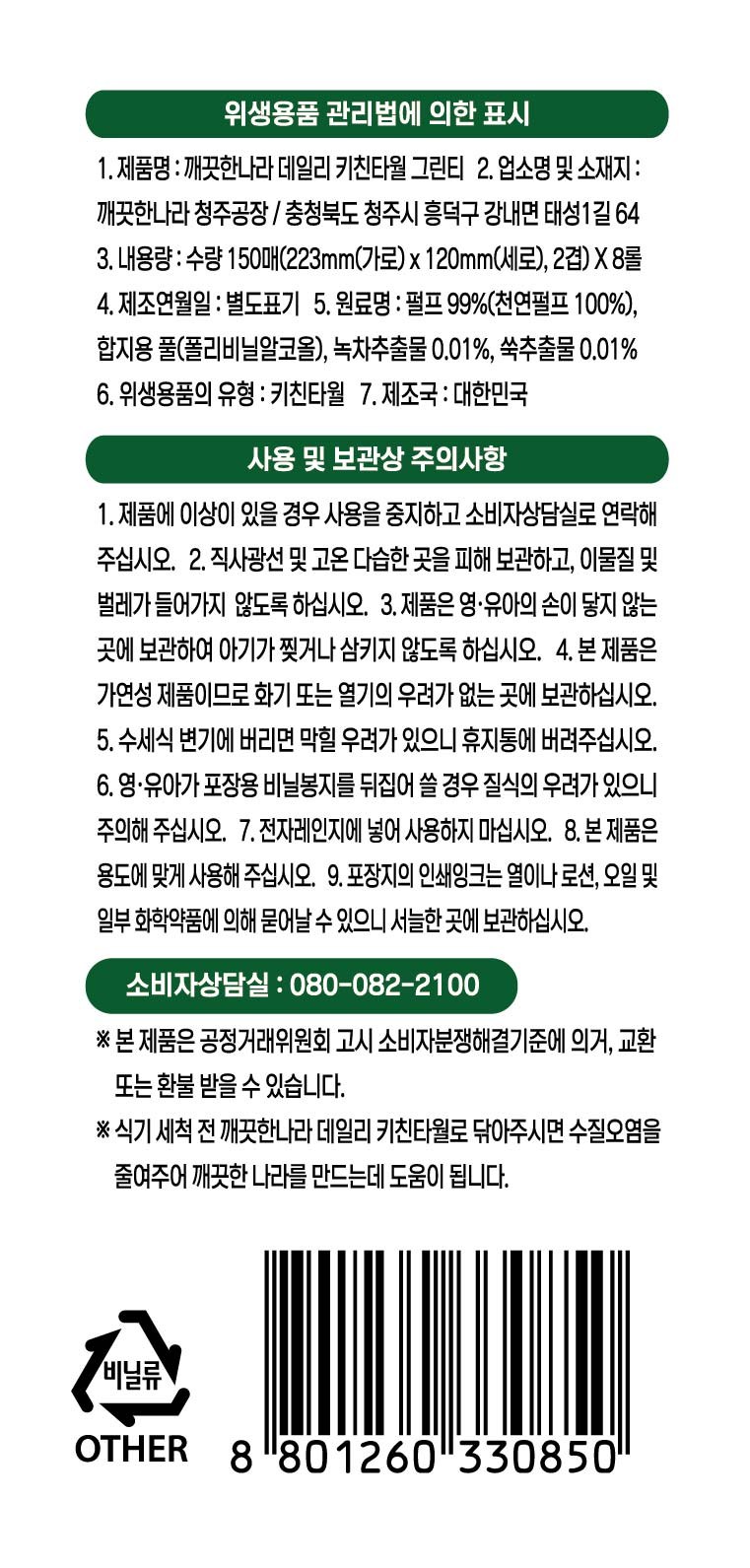 | 품명 및 모델명 | 깨끗한나라 데일리 키친타올 그린티 | 인증/허가 사항 | 위생용품 |