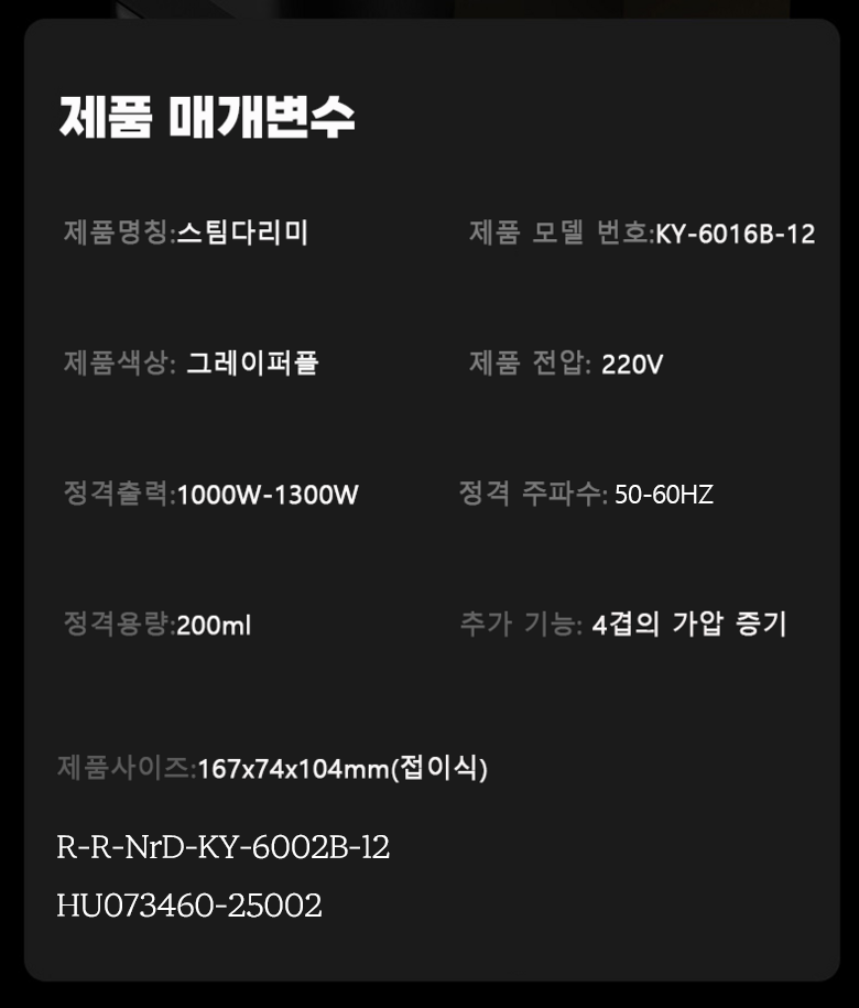 | 품명 및 모델명 | 스팀다리미 KY-6016B-12 | KC 인증정보 | R-R-NrD-KY-6002B-12 / HU073460-25002 |
