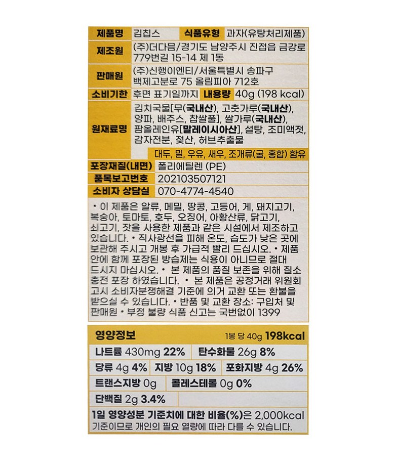 | 제품명 | 김칩 | 식품의 유형 | 과자(유탕처리제품) |