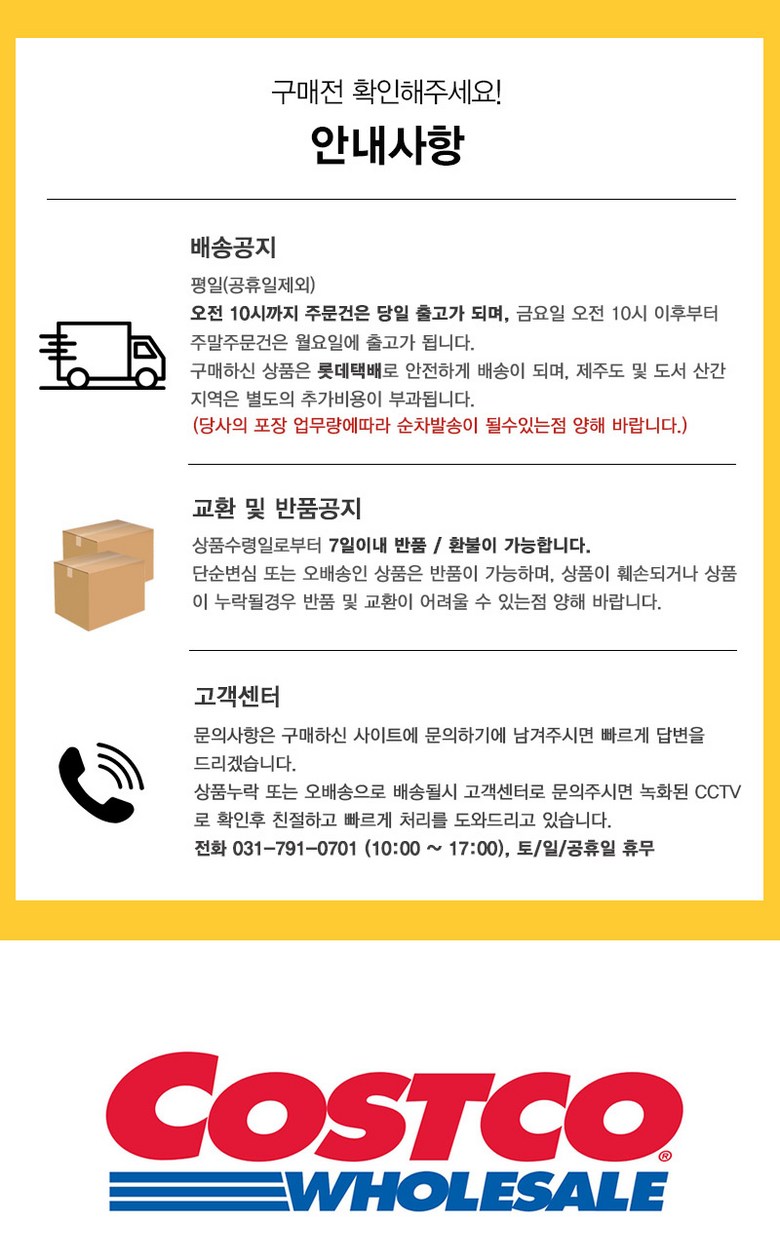 | 교환/반품 비용 (왕복비용) | 6,000원 - 단, 고객 변심의 경우에만 발생 - 도서산간 및 일부 지역 추가비용 발생 |