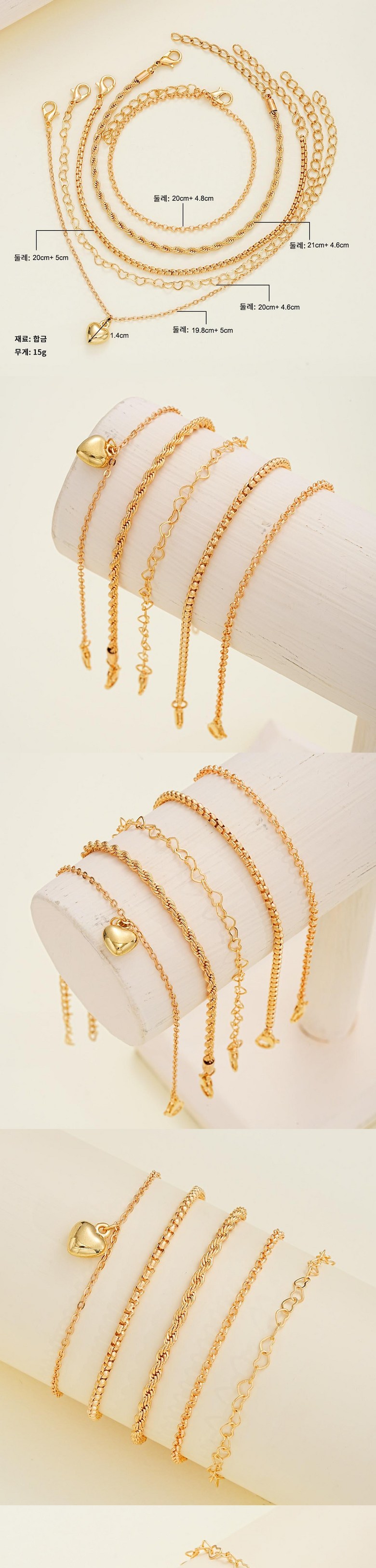 | 치수 | 가는 체인 24.8cm + 꽈배기 체인 25.6cm + 더블 하트 체인 25cm + 하트 체인 24.6cm + 하트 펜던트 체인 26.2cm | 착용 시 주의사항 | 상품 상세페이지 참조 |