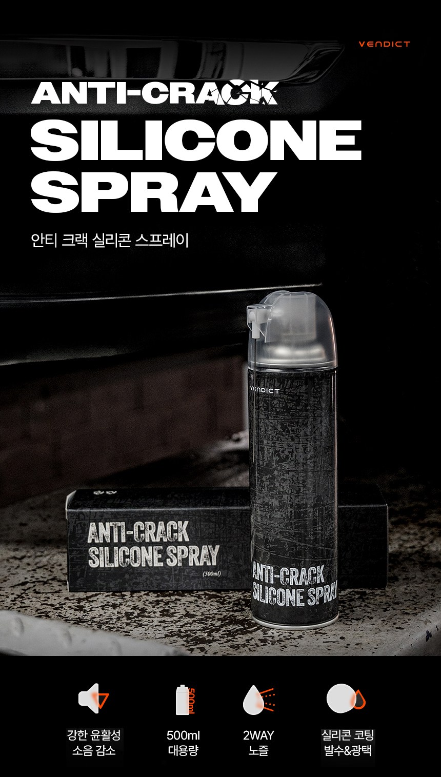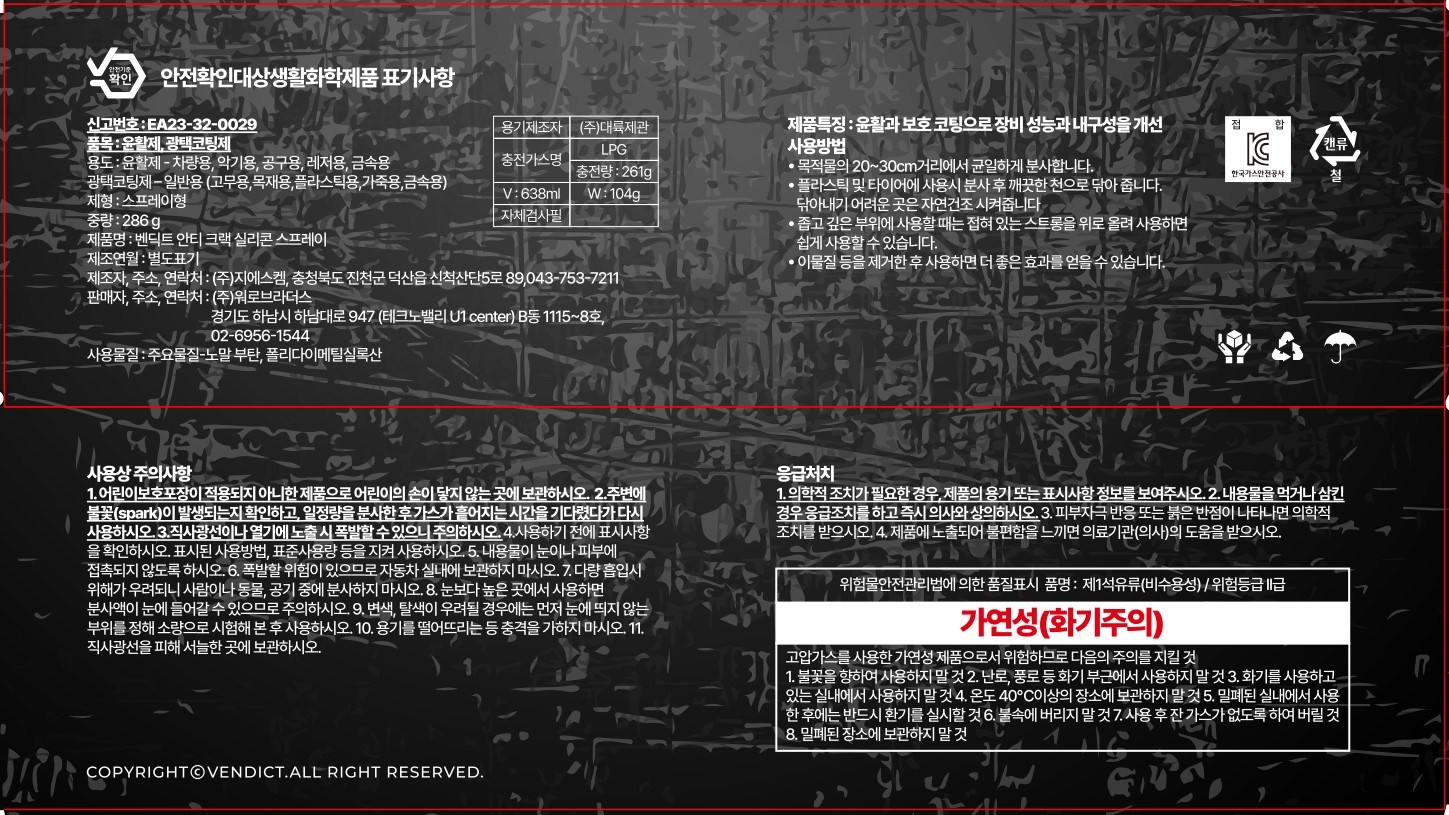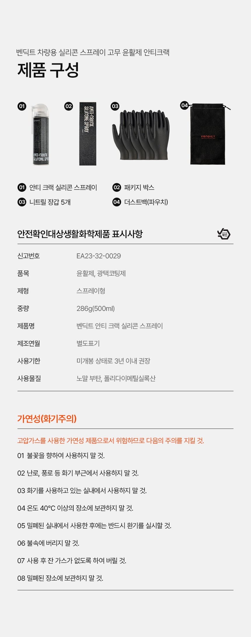 | 품목 및 제품명 | 윤활제, 광택코팅제 / 벤딕트 안티 크랙 실리콘 스프레이 | 용도(표백제의 경우 계열을 함께표시) 및 제형 | 일반용 (가죽용), 일반용 (고무용), 일반용 (금속용), 일반용 (목재용), 일반용 (플라스틱용), 공구용, 금속용, 레저용, 악기용, 차량용 / 스프레이형 |