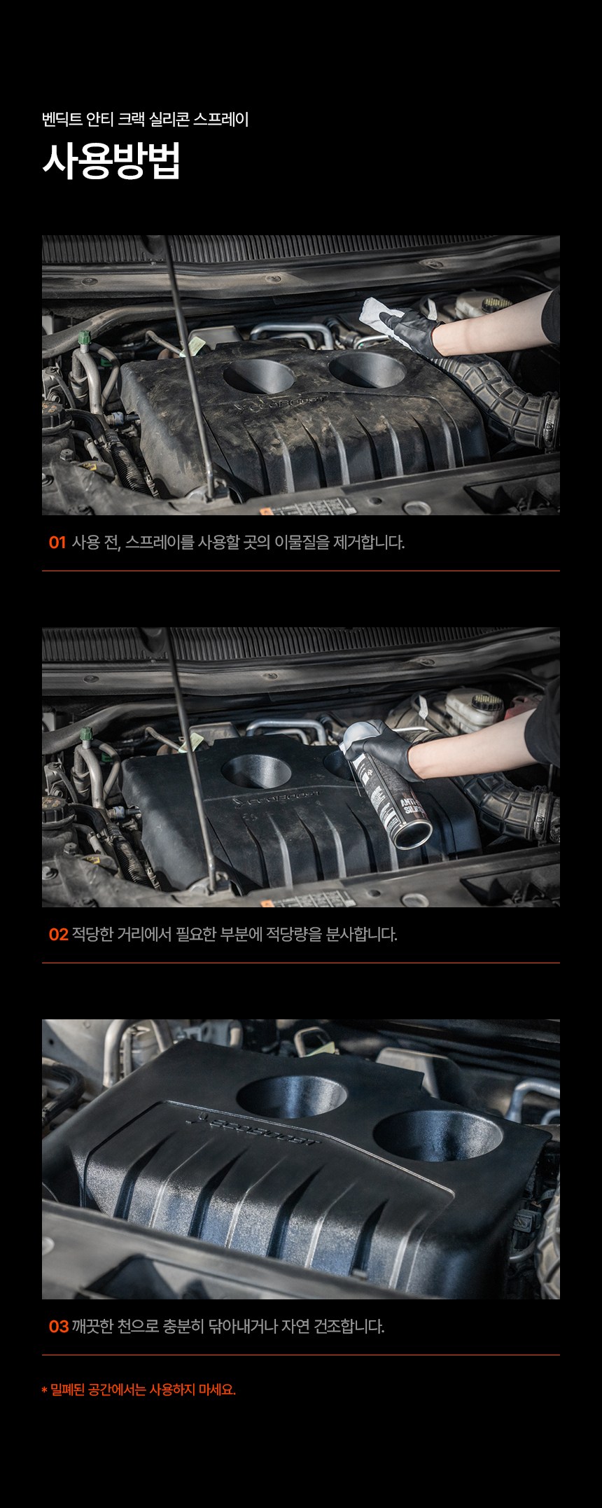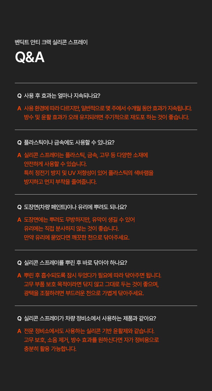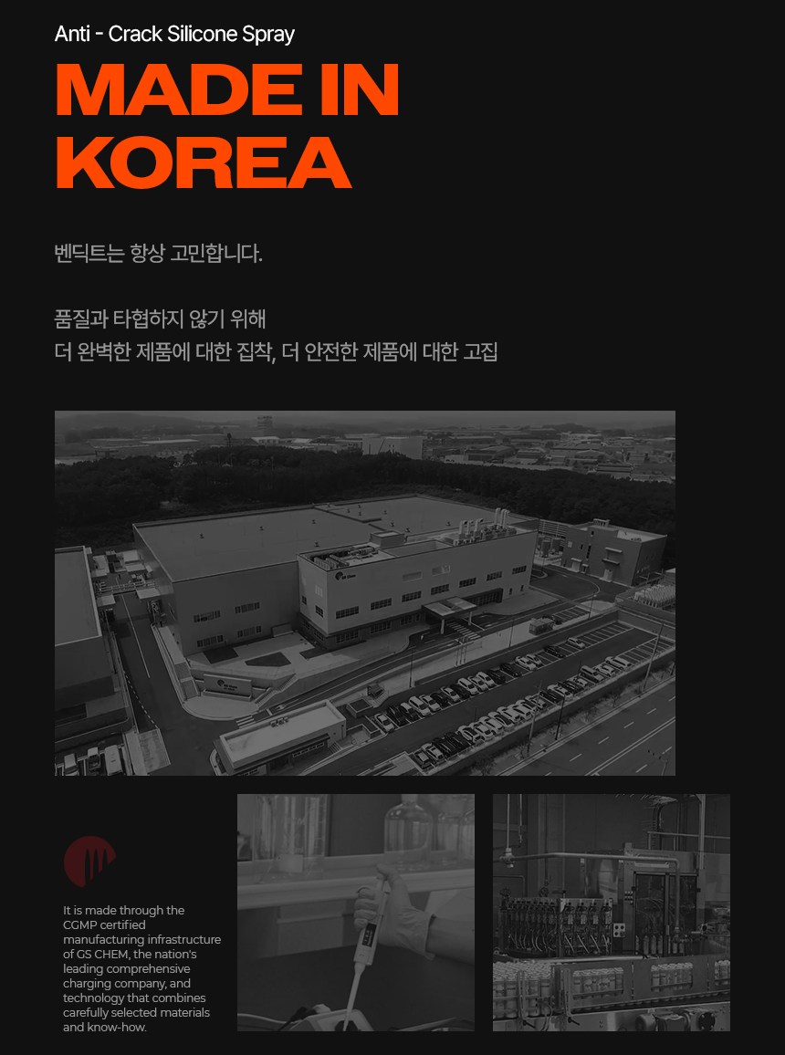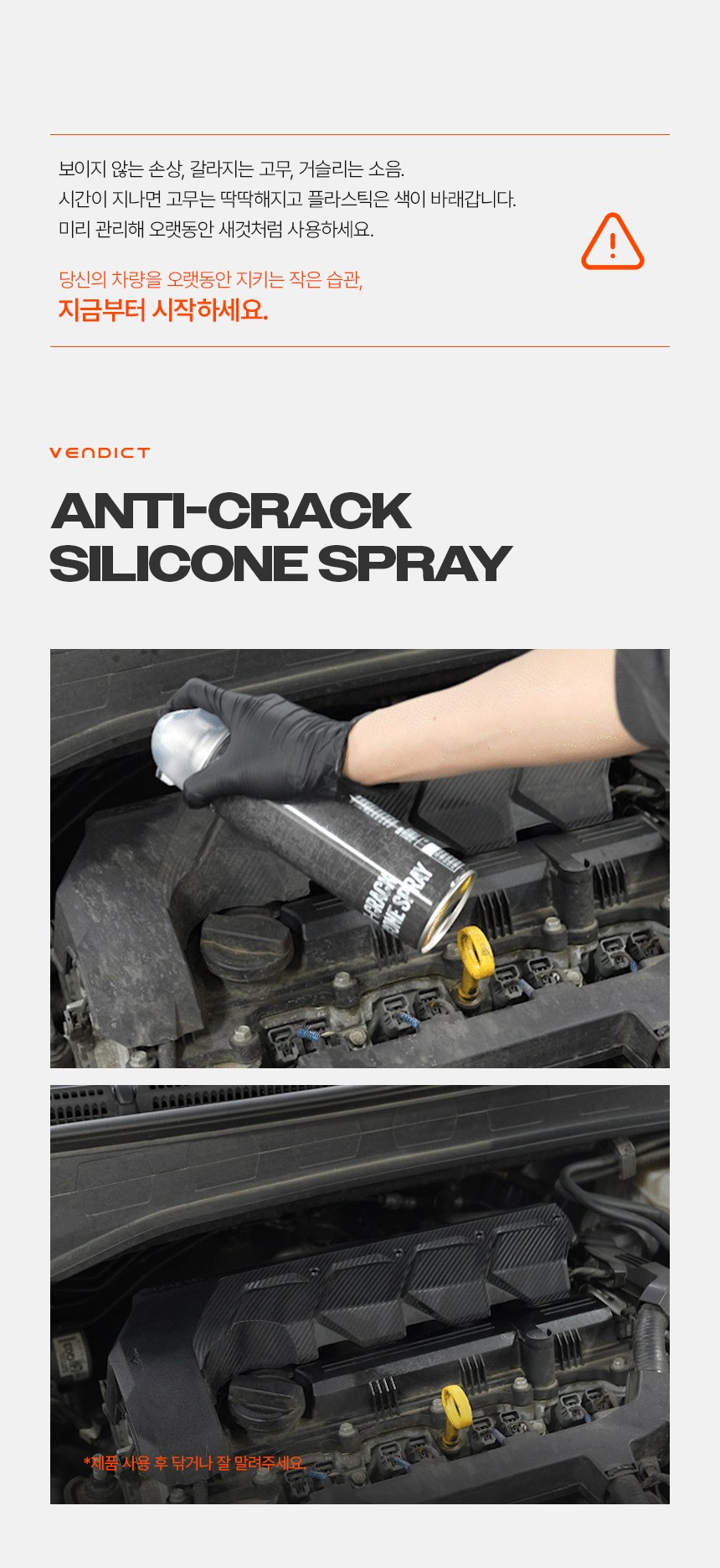 | 품목 및 제품명 | 윤활제, 광택코팅제 / 벤딕트 안티 크랙 실리콘 스프레이 | 용도(표백제의 경우 계열을 함께표시) 및 제형 | 일반용 (가죽용), 일반용 (고무용), 일반용 (금속용), 일반용 (목재용), 일반용 (플라스틱용), 공구용, 금속용, 레저용, 악기용, 차량용 / 스프레이형 |