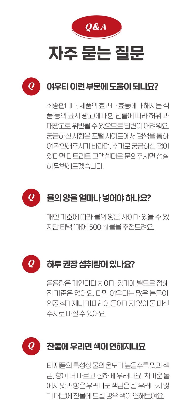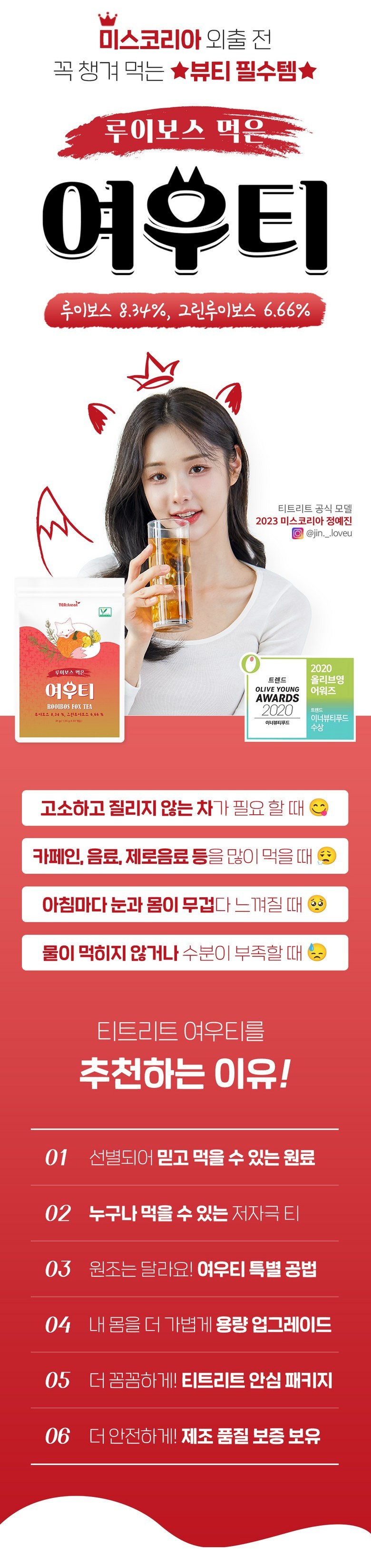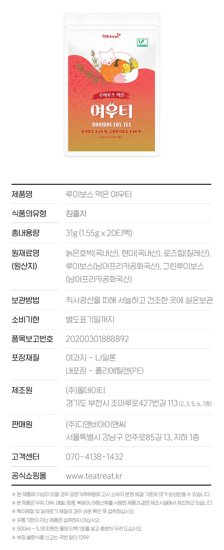 | 제품명 | 티트리트 루이보스 먹은 여우티 20개입 | 식품의 유형 | 상품 상세페이지 참조 |