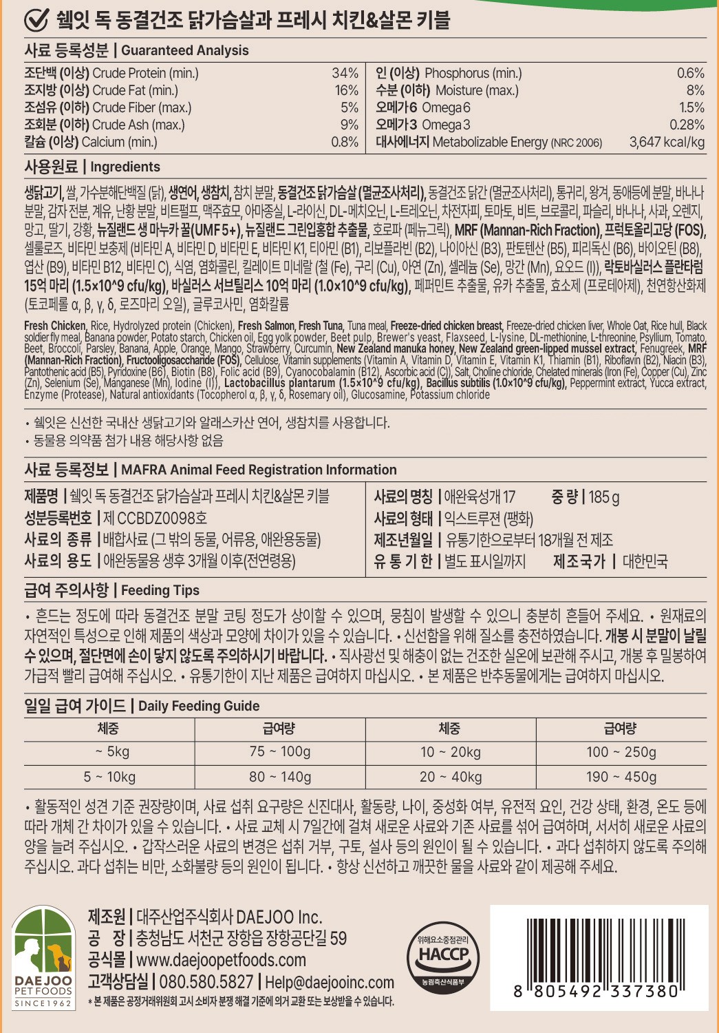 | 품명 및 모델명 | 쉨잇 독 동결건조 닭가슴살과 프레시 치킨&살몬 키블 | 인증/허가 사항 | 사료관리법에 따른 성분등록 번호 : 컨텐츠 참조 |