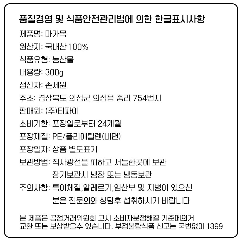 | 제조연월일, 소비기한 또는 품질유지기한 | 소비기한(또는 유통기한) : 2027년 01월 22일 이거나 그 이후인 상품 제조년월일 : 2025년 02월 02일 이후인 제조상품 | 세부 품목군별 표시사항 | 농수산물 : 유전자변형(해당 없음) / 지리적 표시사항(해당 없음) |