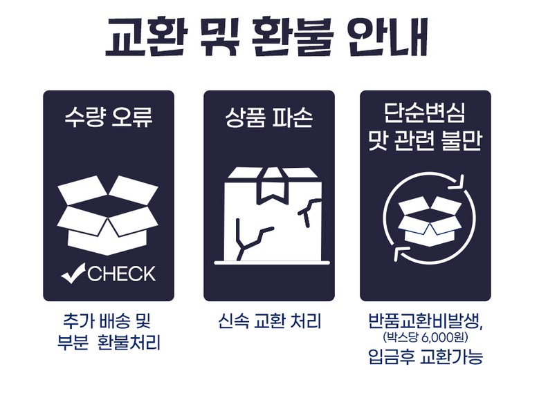 | 교환/반품 신청 기준일 | ㆍ단순변심에 의한 로켓배송 상품의 교환/반품은 제품 수령 후 30일 이내까지, 교환/반품 제한사항에 해당하지 않는 경우에만 가능 (교환/반품 비용 고객부담) ㆍ상품의 내용이 표시·광고의 내용과 다른 경우에는 상품을 수령한 날부터 3개월 이내, 그 사실을 안 날 또는 알 수 있었던 날부터 |