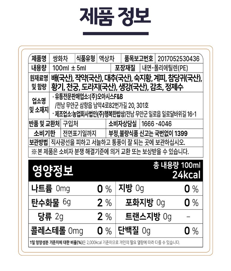 | 제품명 | 상품 상세페이지 참조 | 식품의 유형 | 액상차 |