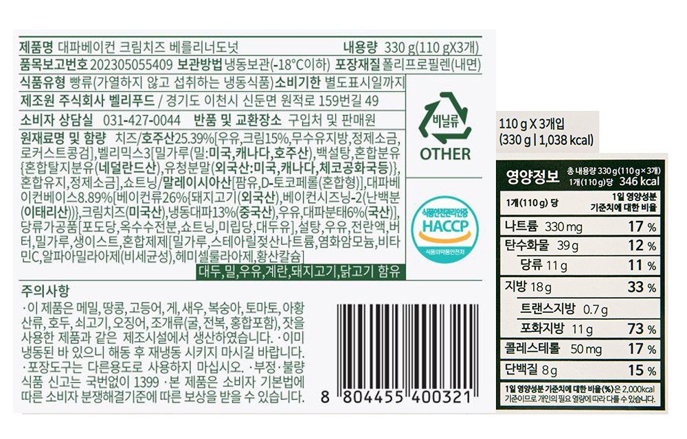 | 포장단위별 내용물의 용량(중량), 수량 | 3개입 x 2개 | 원재료명 및 함량 | 컨텐츠 참조 |