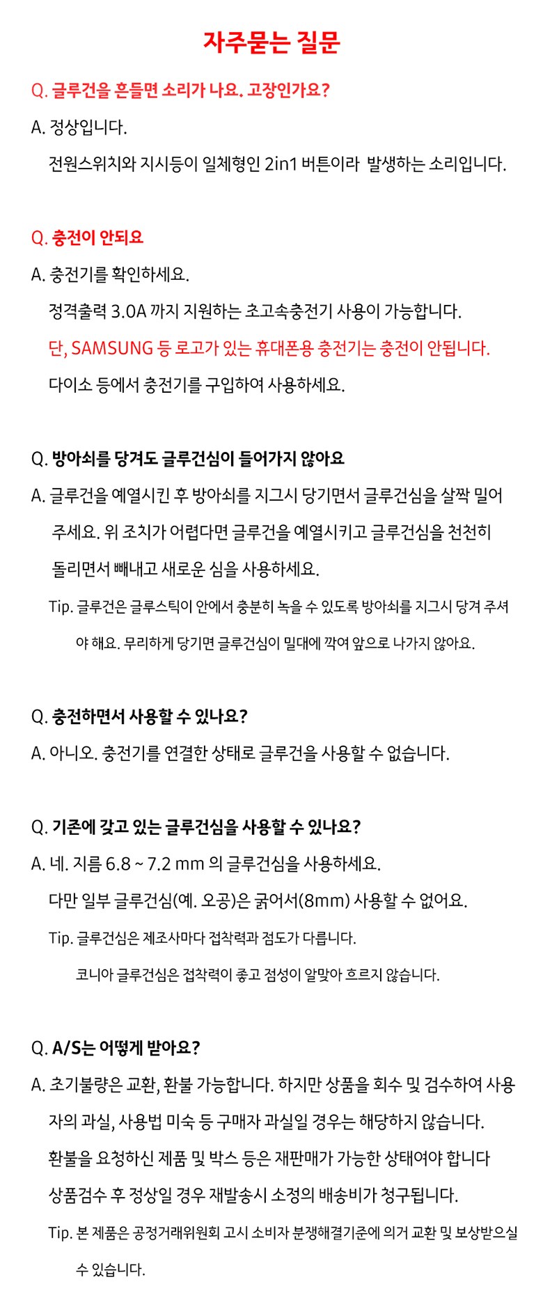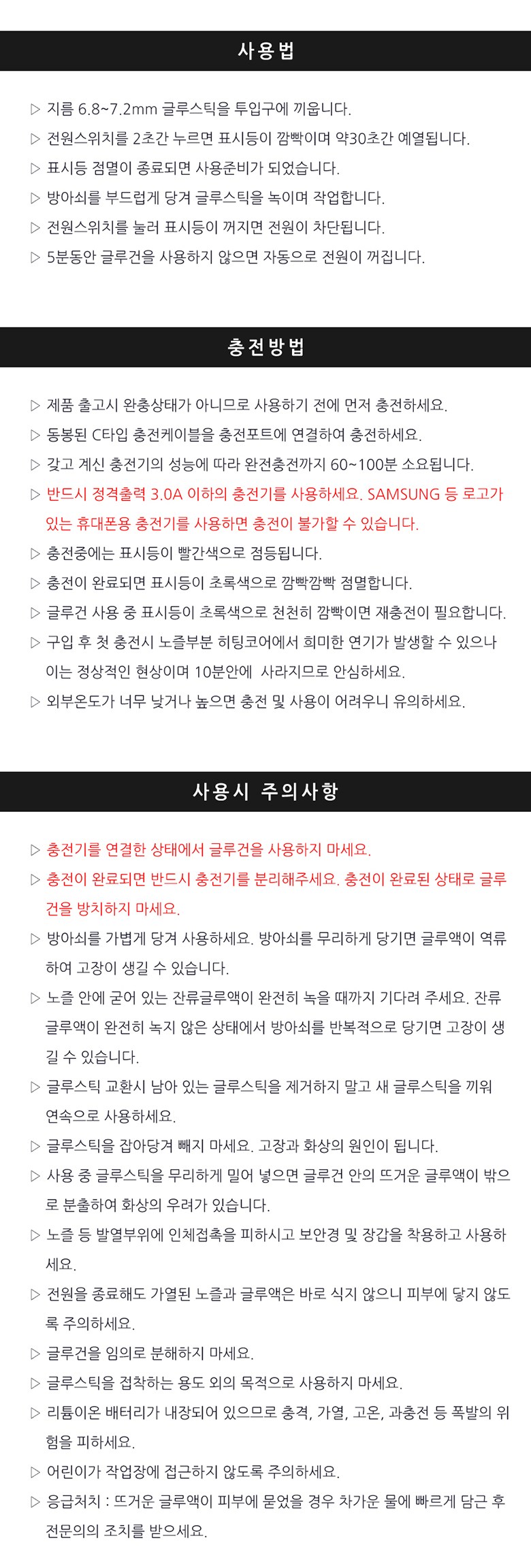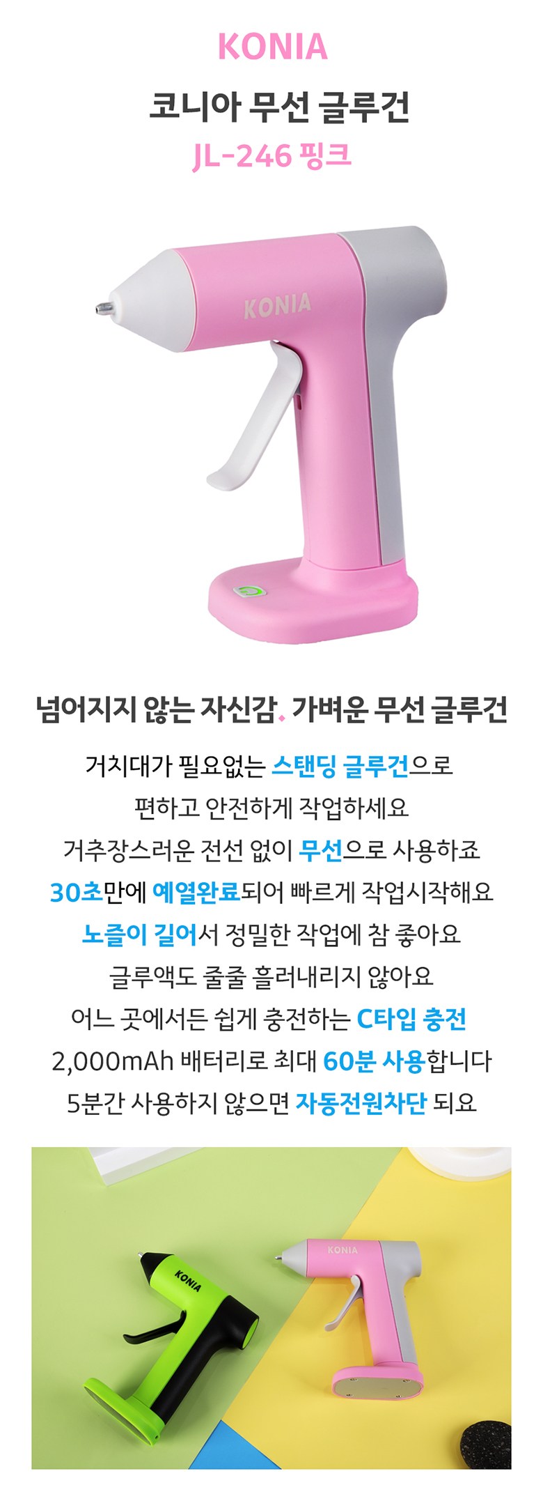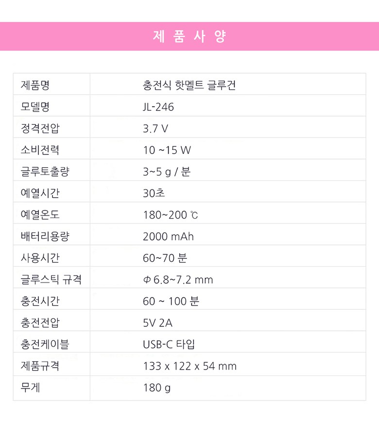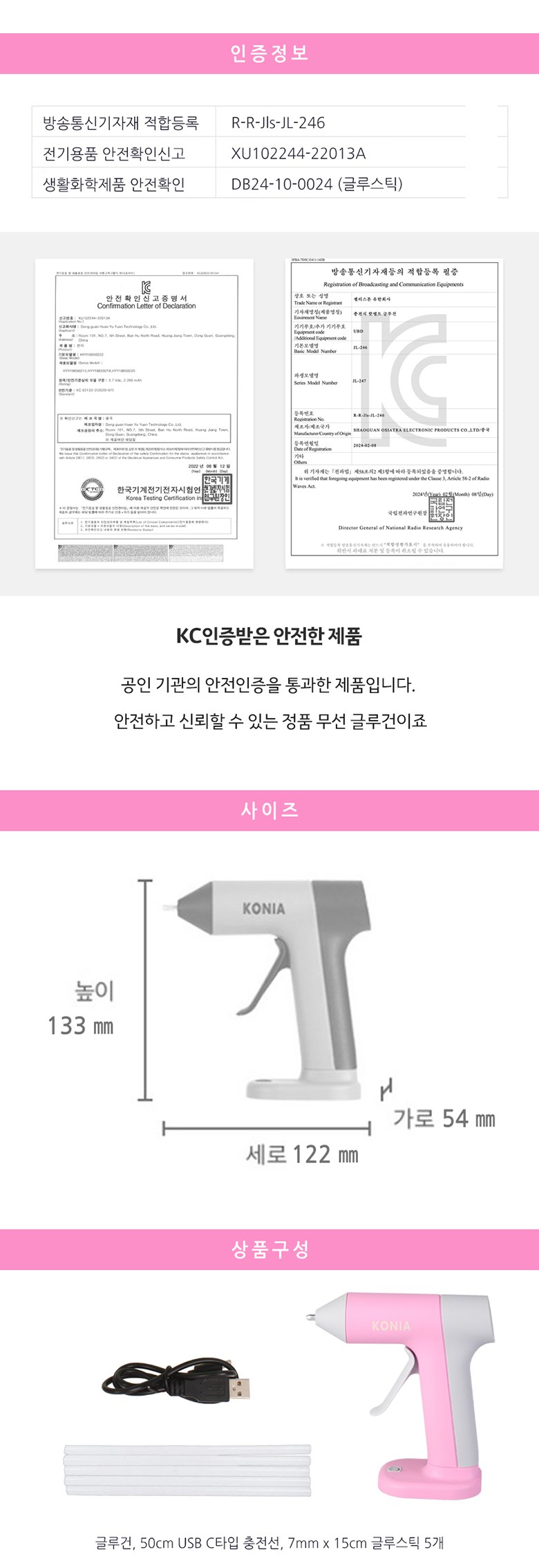 | 품명 및 모델명 | 충전식 핫멜트 무선글루건 JL-246 핑크 | 인증/허가 사항 | R-R-Jls-JL-246 / XU102244-22013A / DB24-10-0024 |