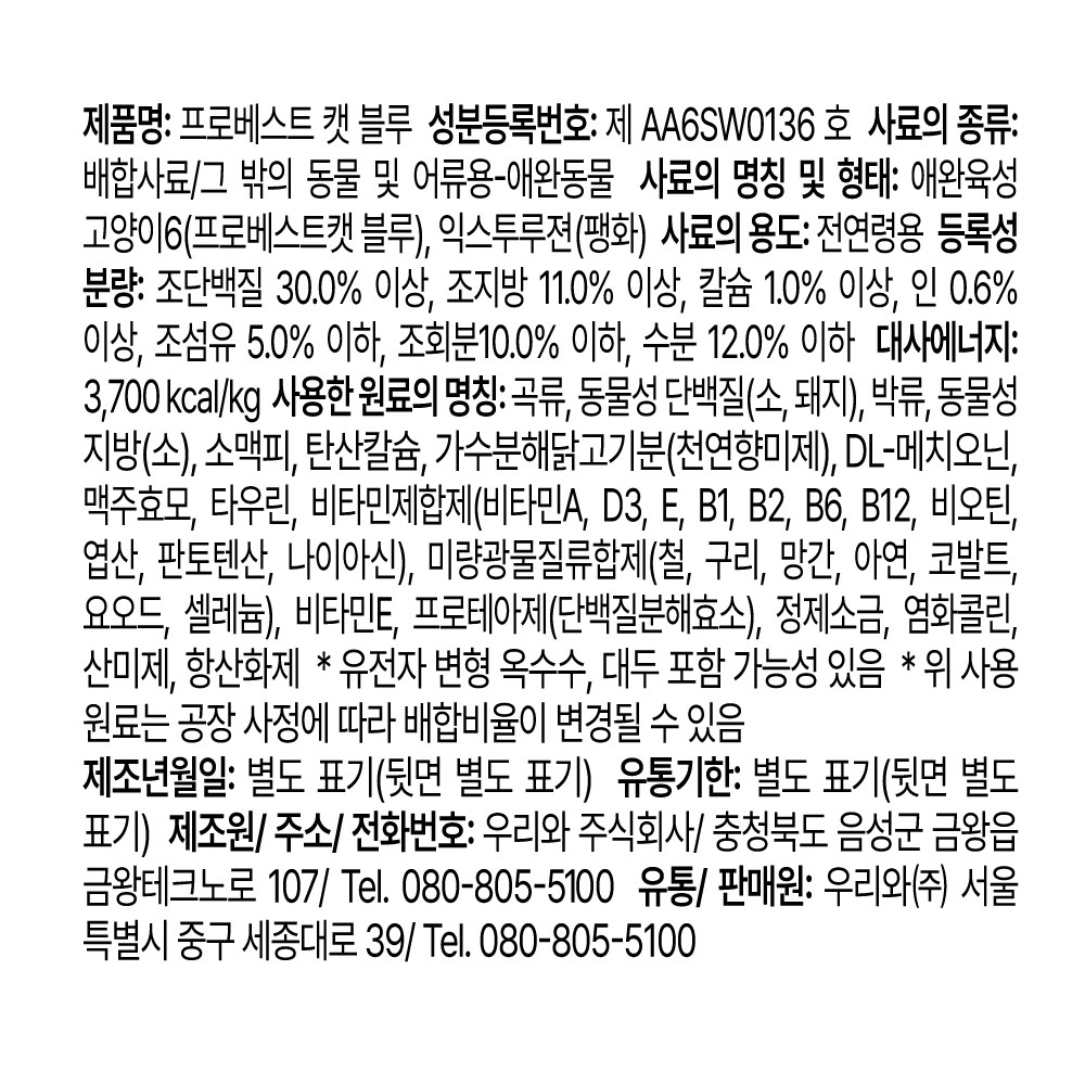 | 품명 및 모델명 | 프로베스트캣 블루 | 인증사항 | 사료관리법에 따른 성분등록번호 : 컨텐츠 참조 |