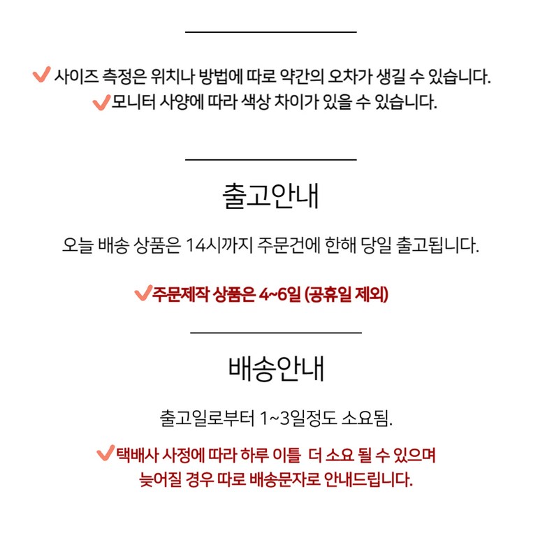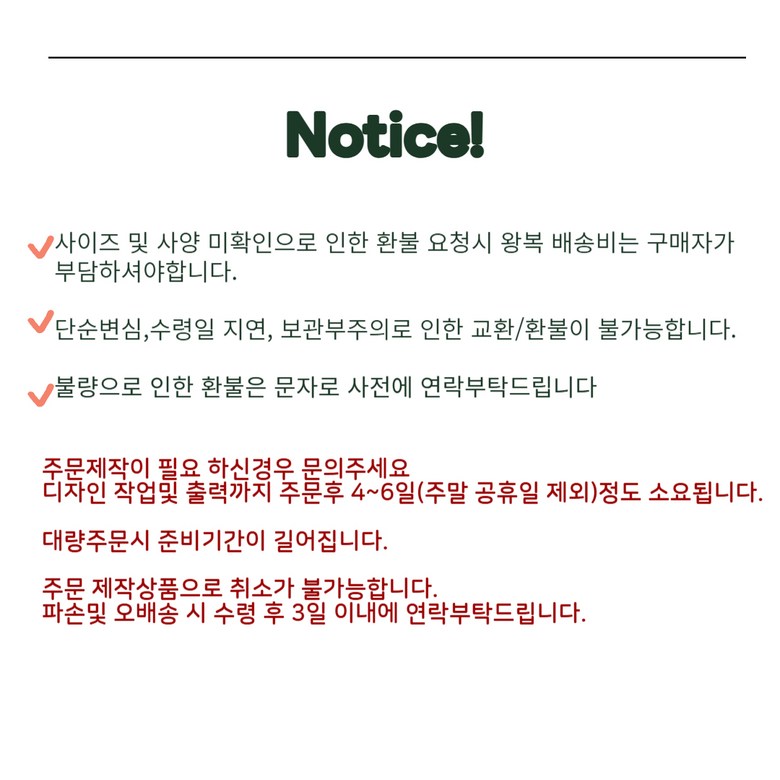 - ㆍ모니터 해상도의 차이로 인해 색상이나 이미지가 실제와 달라, 고객이 단순 변심으로 교환/반품을 무료로 요청하는 경우