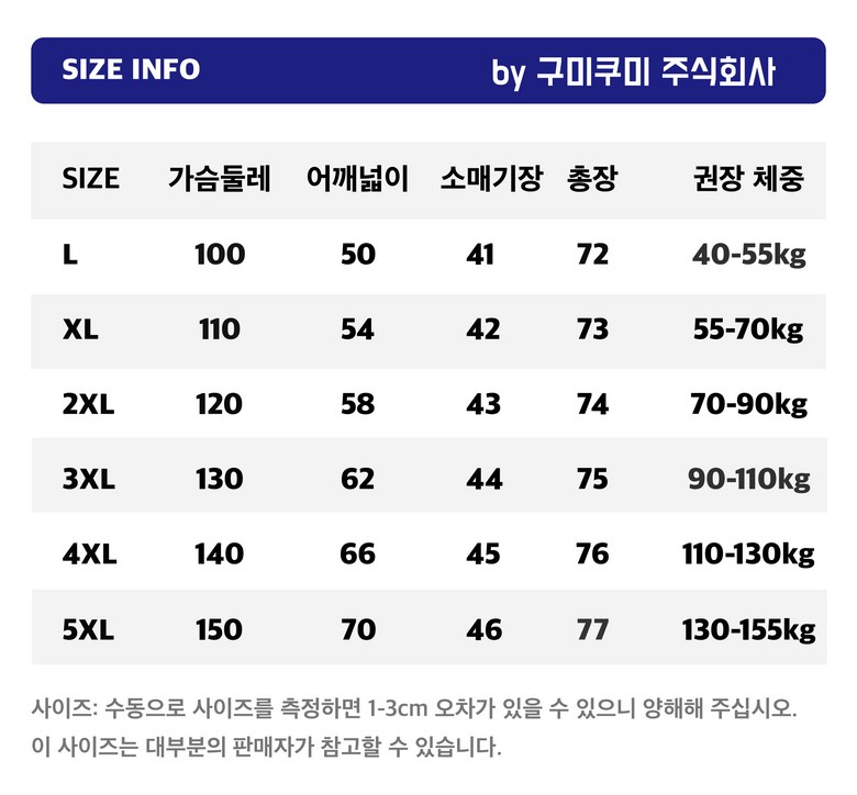 | 치수 | L,XL,2XL,3XL,4XL,5XL | 제조자(수입자) | 구미쿠미 주식회사 |