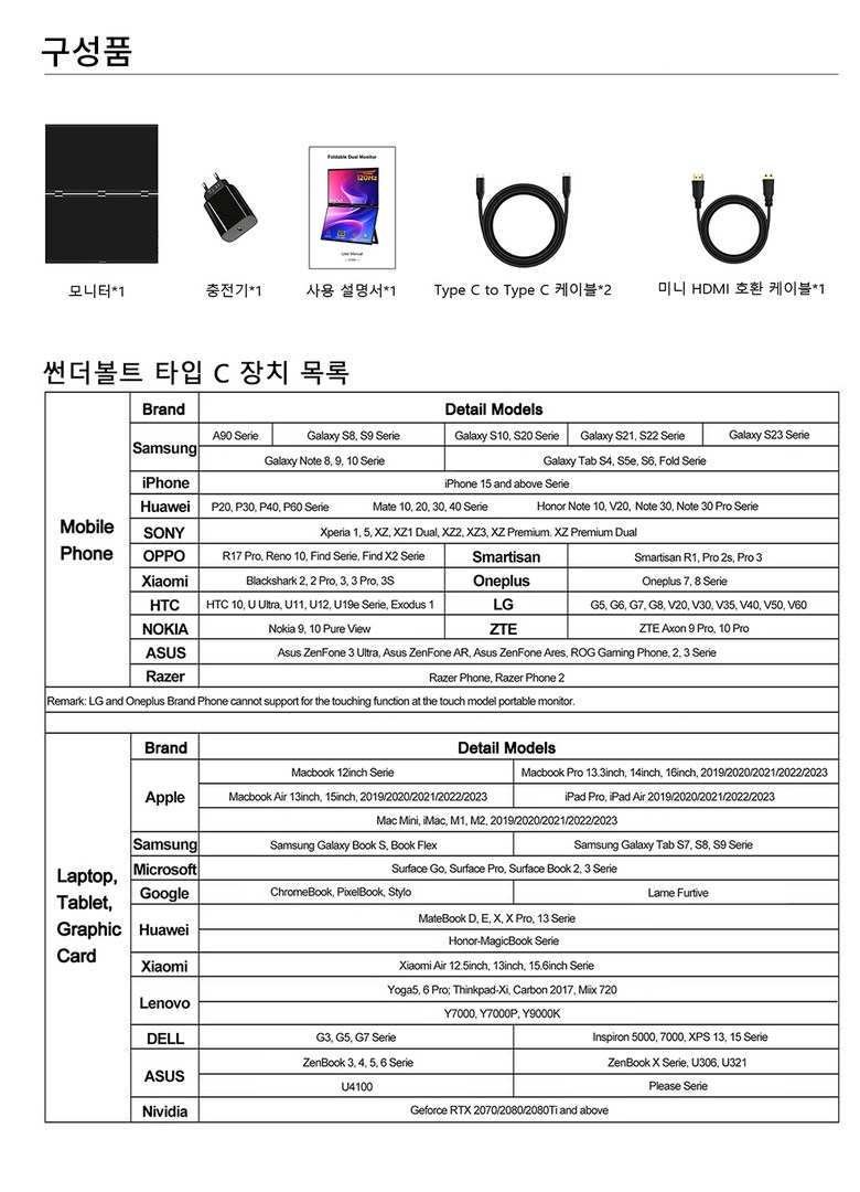 모니터 x1, 1.2미터 C타입 케이블 x2 1.2미터 미니 HDMI 호환 케이블 x1 충전기 x1 사용 설명서 x1