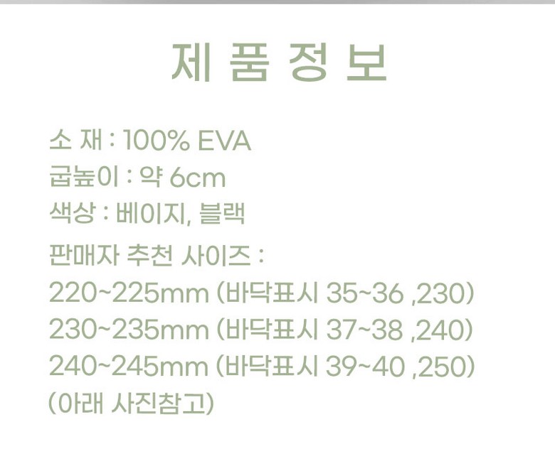 | 제품의 주소재(운동화인 경우에는 겉감,안감을 구분하여 표시) | EVA | 색상 | 베이지,블랙 |