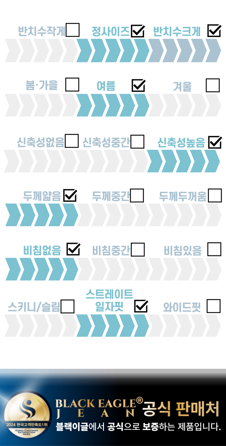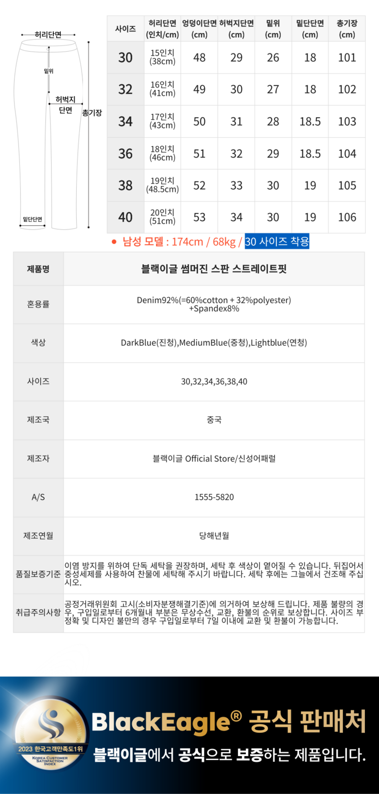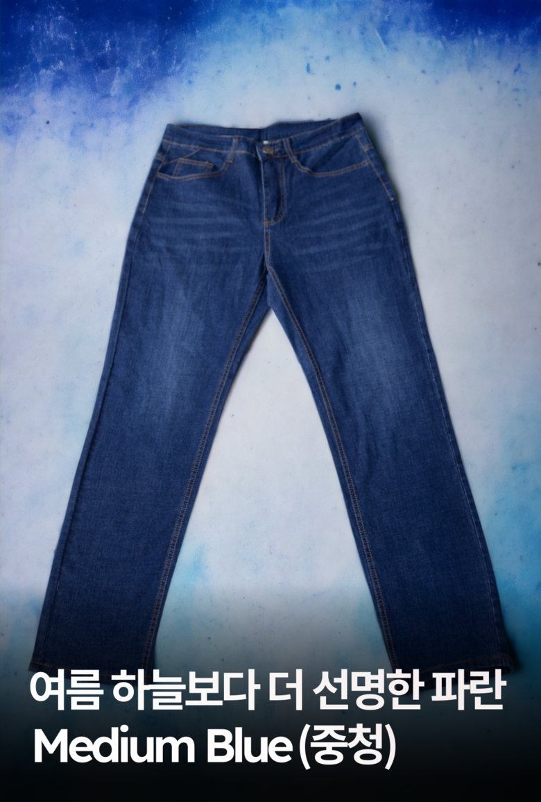| 제품 소재 | Denim92%(=60%cotton+32%polyester) + Spandex8% | 색상 | Dark Blue(진청),Medium Blue(중청),Light Blue(연청) |