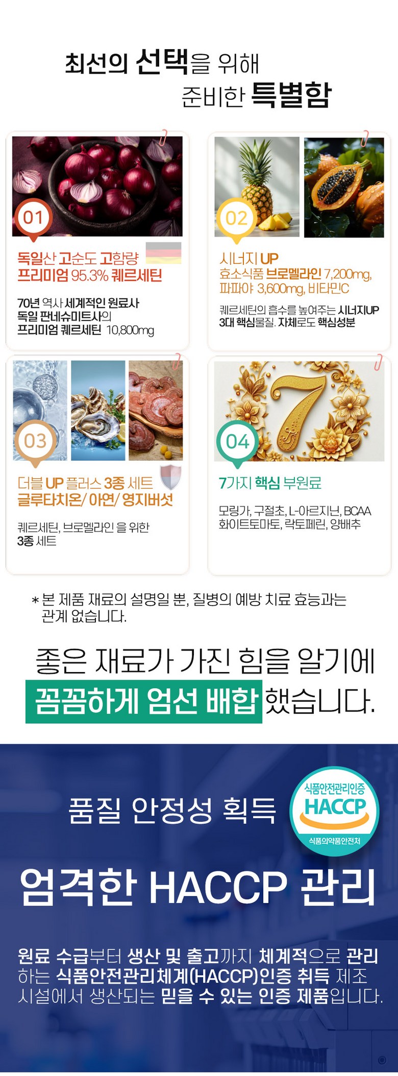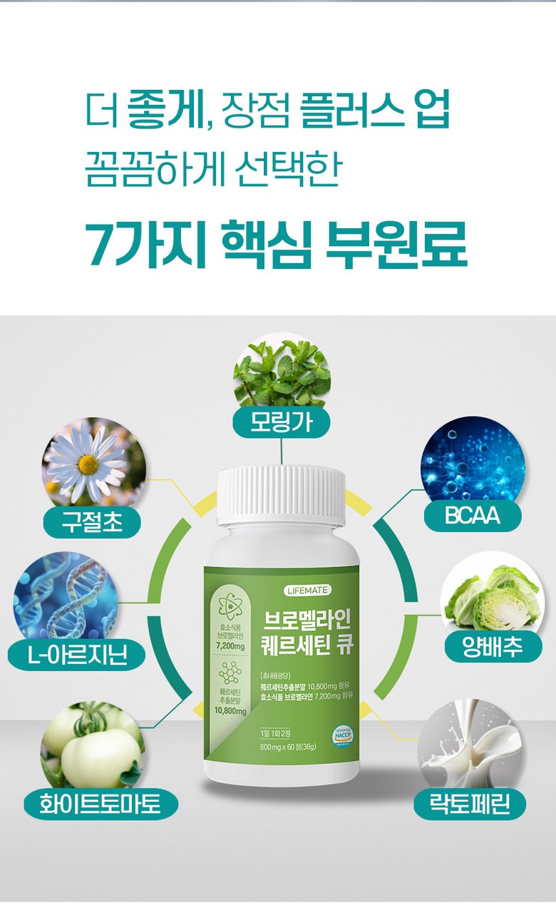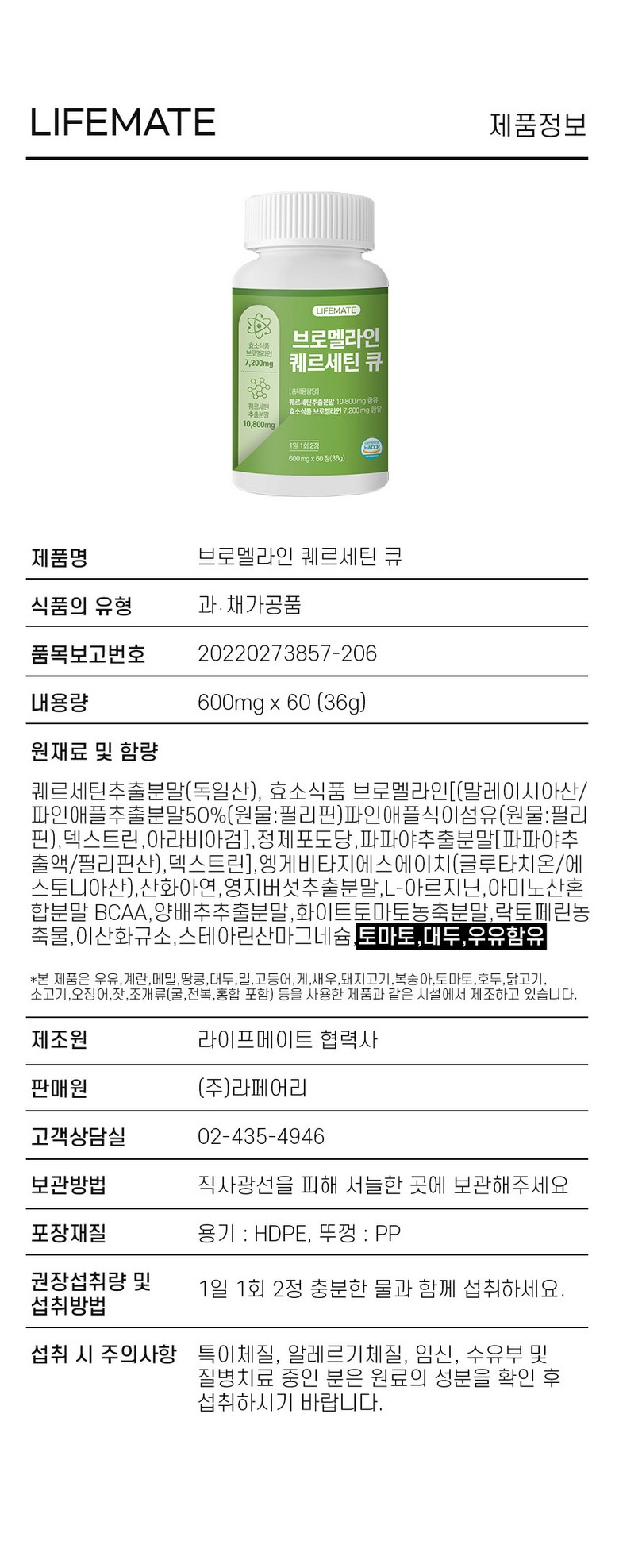 | 원재료명 및 함량 | 퀘르세틴추출분말(독일산), 효소식품 브로멜라인[(말레이시아산/파인애플추출분말50%(원물:필리핀)파인애플식이섬유(원물:필리핀),덱스트린,아라비아검],정제포도당,파파야추출분말[파파야추출액/필리핀산),덱스트린],엥게비타지에스에이치(글루타치온/에스토니아산),산화아연,영지버섯추출분말,L-아르지닌,아미노산혼합분말 BCAA,양배추추출분말,화이트토마토농축분말,락토페린농축물,이산화규소,스테아린산마그네슘,토마토,대두,우유함유 | 영양성분 | 상품 상세페이지 참조 |