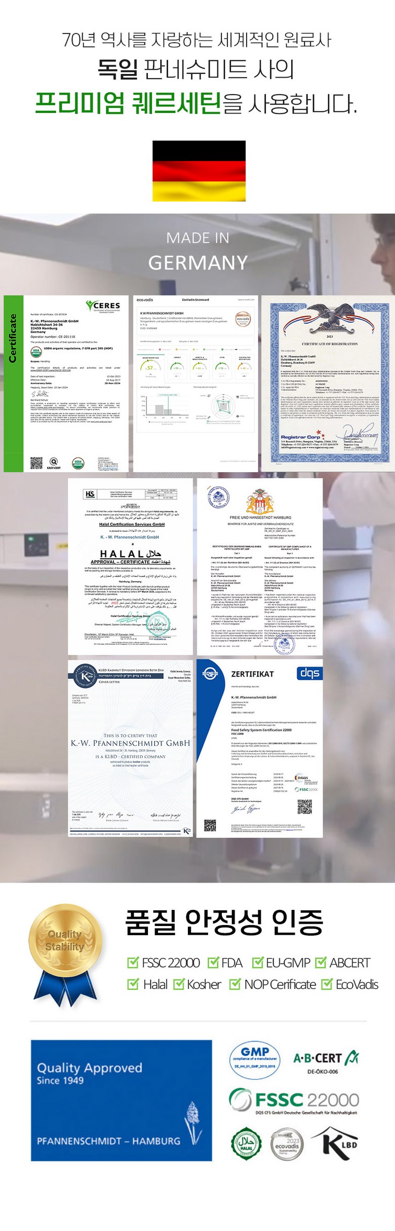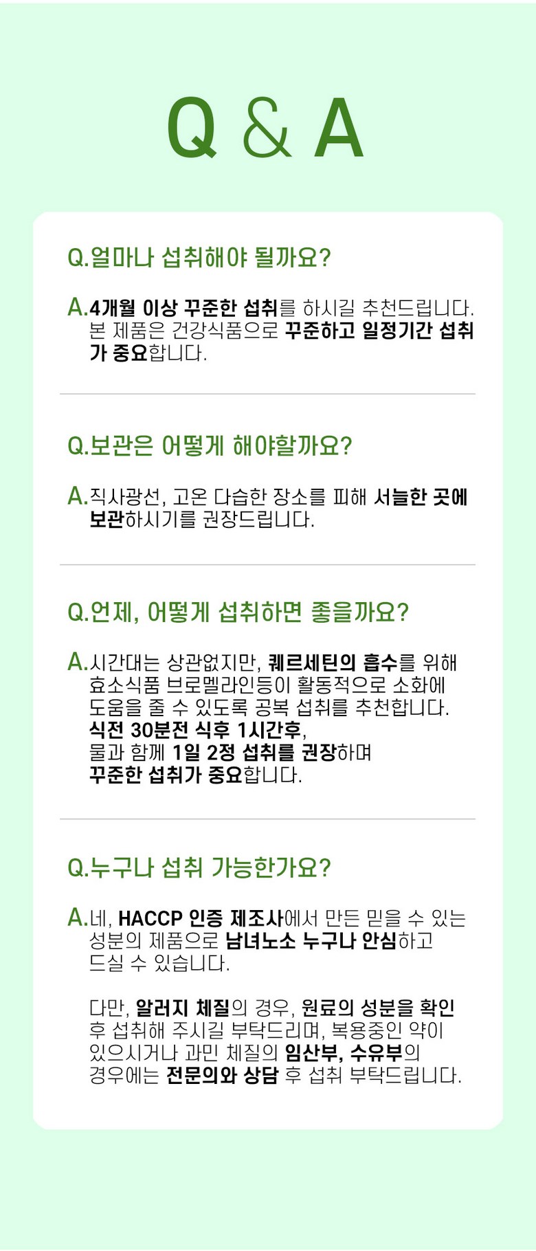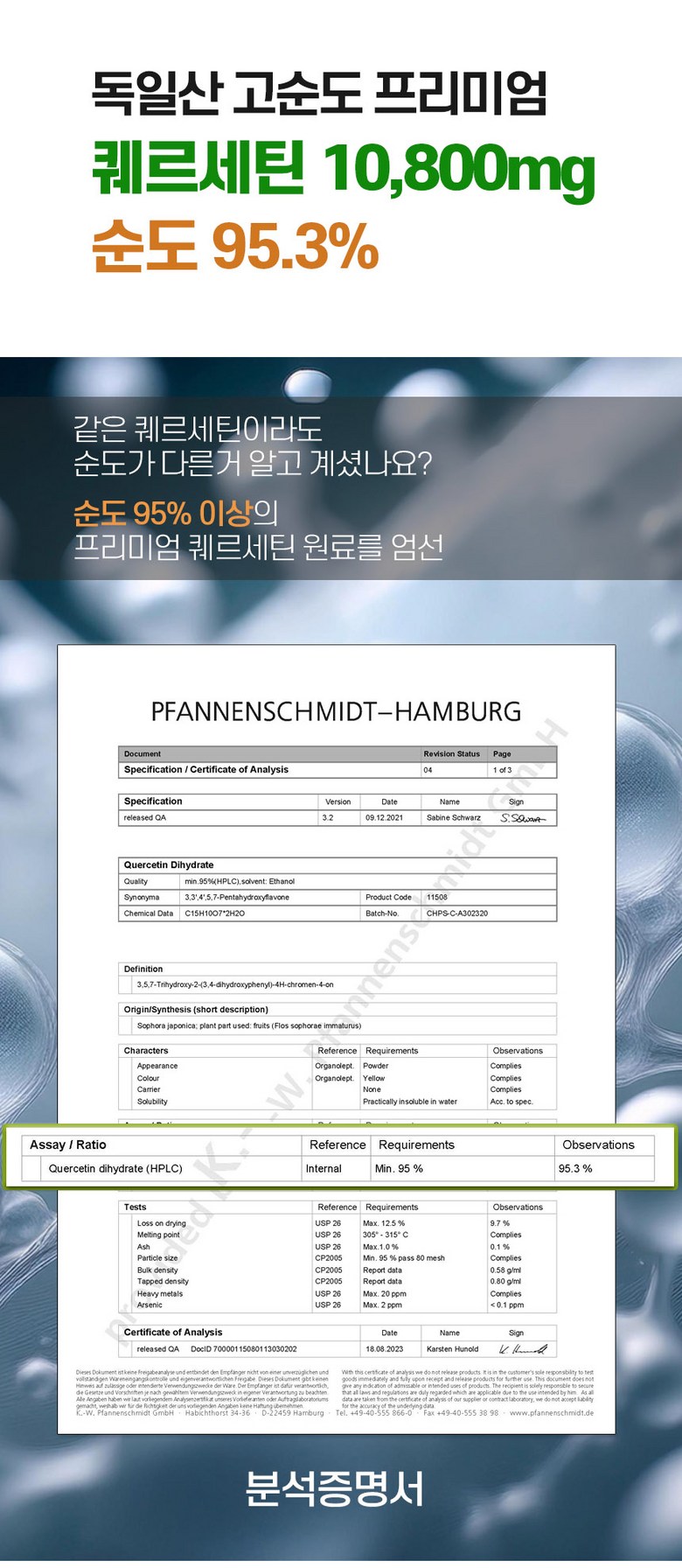 | 원재료명 및 함량 | 퀘르세틴추출분말(독일산), 효소식품 브로멜라인[(말레이시아산/파인애플추출분말50%(원물:필리핀)파인애플식이섬유(원물:필리핀),덱스트린,아라비아검],정제포도당,파파야추출분말[파파야추출액/필리핀산),덱스트린],엥게비타지에스에이치(글루타치온/에스토니아산),산화아연,영지버섯추출분말,L-아르지닌,아미노산혼합분말 BCAA,양배추추출분말,화이트토마토농축분말,락토페린농축물,이산화규소,스테아린산마그네슘,토마토,대두,우유함유 | 영양성분 | 상품 상세페이지 참조 |