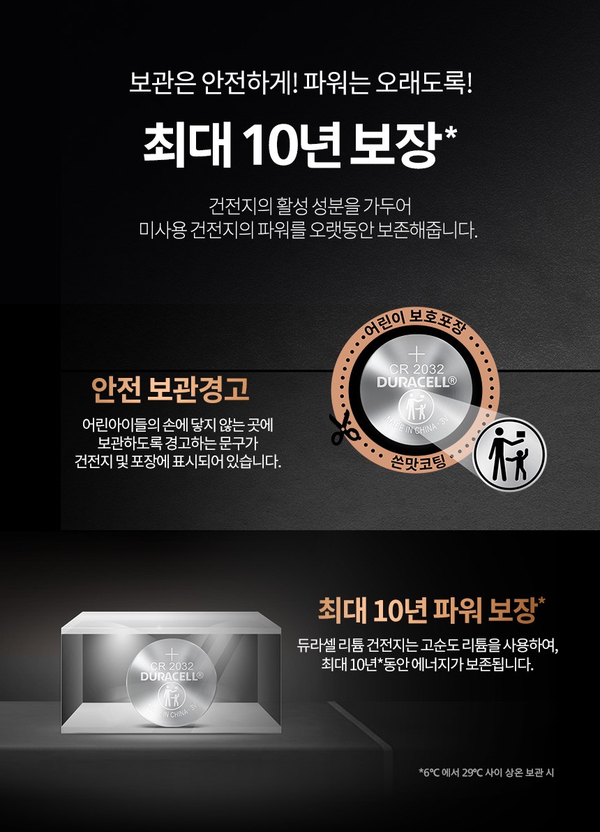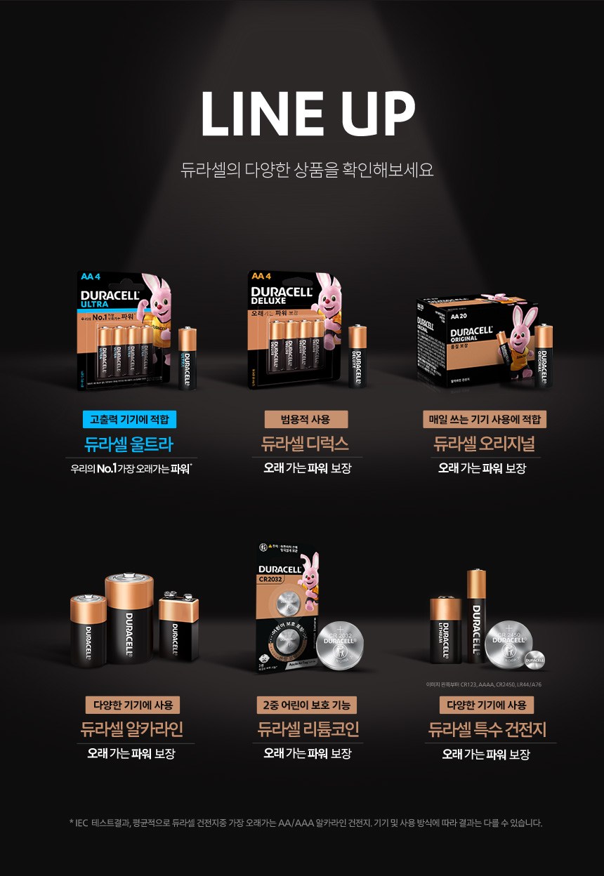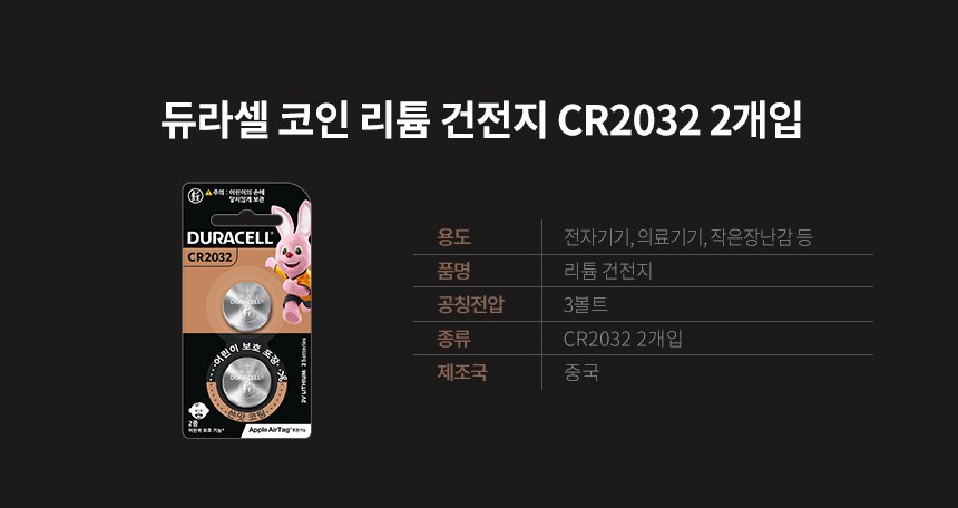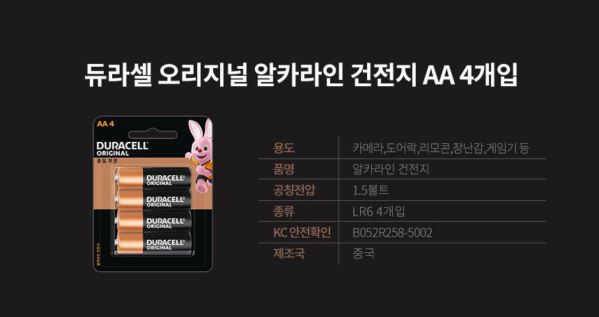 | 제조국(원산지) | 중국 | 제조자(수입자) | 알카라인 건전지: Duracell China Ltd. / 엠큐네트웍스(주), 코인 리튬: 듀라셀 / 엠큐네트웍스(주) |