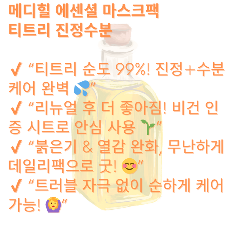 - 정제수, 글리세린, 다이프로필렌글라이콜, 1,2-헥산다이올, 티트리추출물(12,000 ppm), 메틸프로판다이올, 프로판다이올, 하이드록시아세토페논, 알지닌, 카보머, 아미노부티릭애씨드, 부틸렌글라이콜, 잔탄검, 폴리글리세릴-10라우레이트, 아데노신, 폴리글리세릴-4라우레이트, 해수, 다이소듐이디티에이, 트루로즈오브예리코추출물, 티트리잎오일(90 ppm), 폴리쿼터늄-51, 하이드로제네이티드레시틴, 베르가모트오일, 티트리잎추출물(10 ppm), 4-터피네올(10 ppm), 글리세릴글루코사이드, 화이트티트리잎추출물(10 ppm), 티트리꽃/잎/줄기추출물(10 ppm), 티트리잎수(10 ppm), 트레할로오스, 소엽잎추출물, 서양민들레뿌리줄기/뿌리추출물, 향부자추출물, 소두구씨오일, 판테놀, 세라마이드엔피