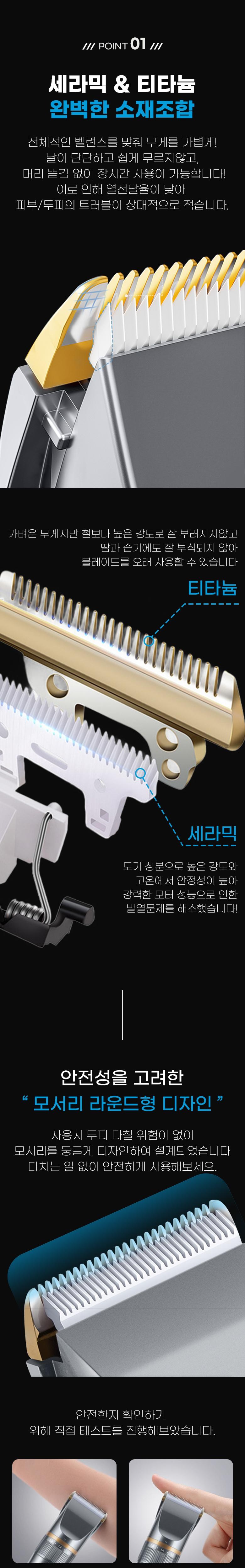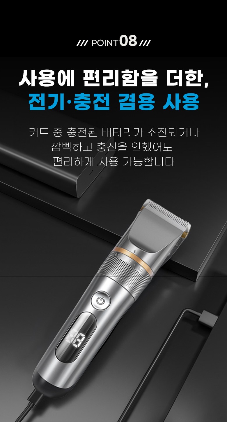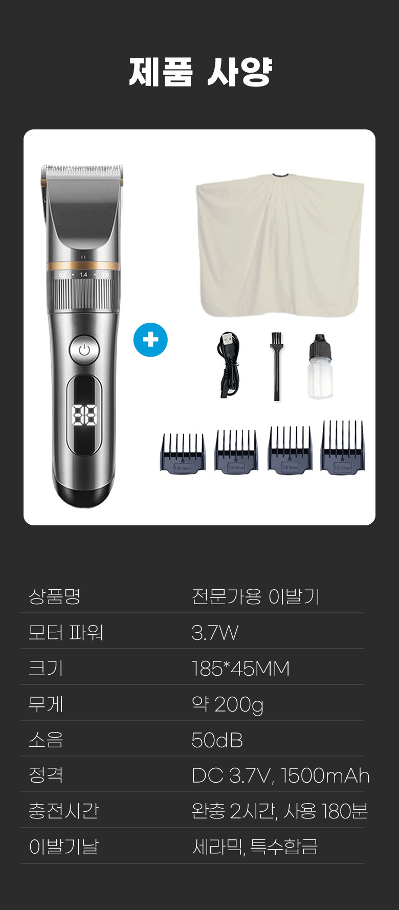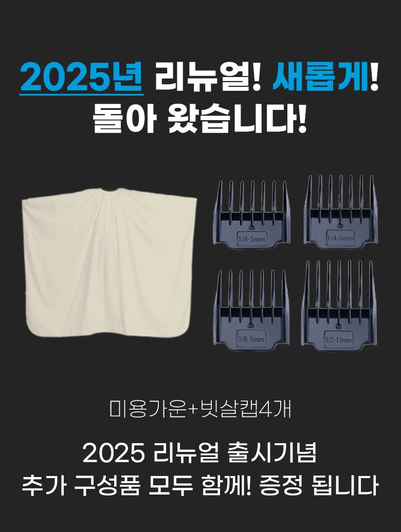 - 구성품: 본체, 미용가운,USB충전연결선, 청소용 솔, 오일, 빗살캡4종,