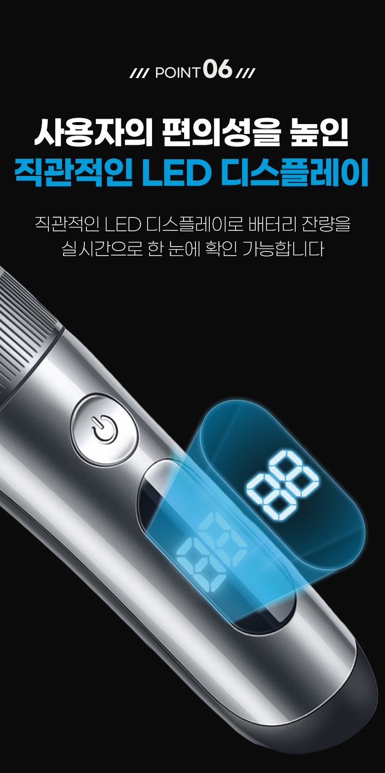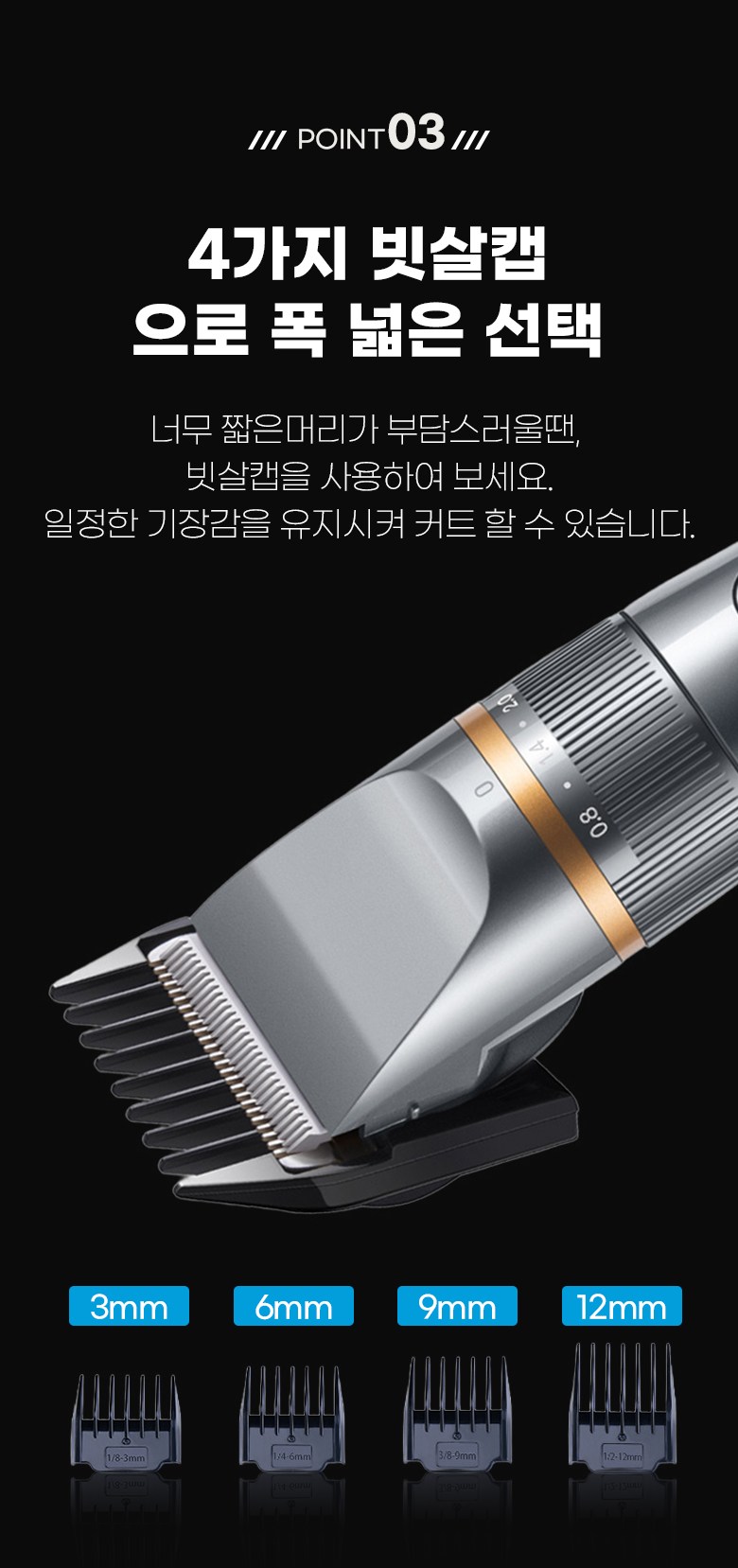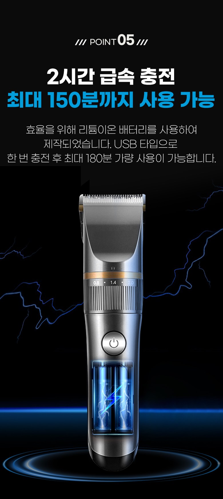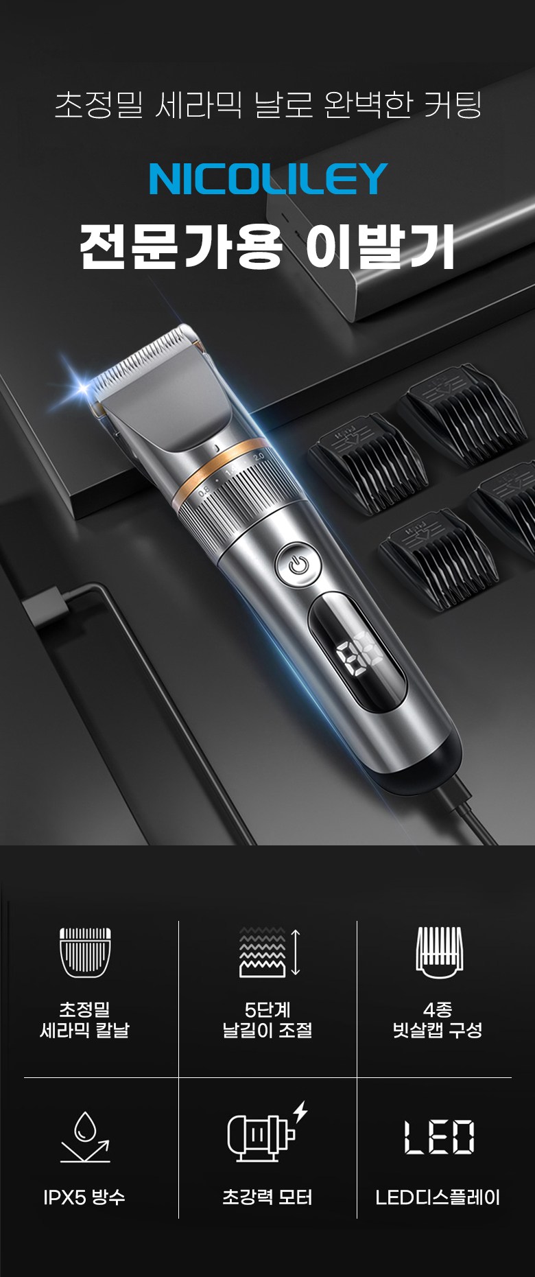 - 구성품: 본체, 미용가운,USB충전연결선, 청소용 솔, 오일, 빗살캡4종,