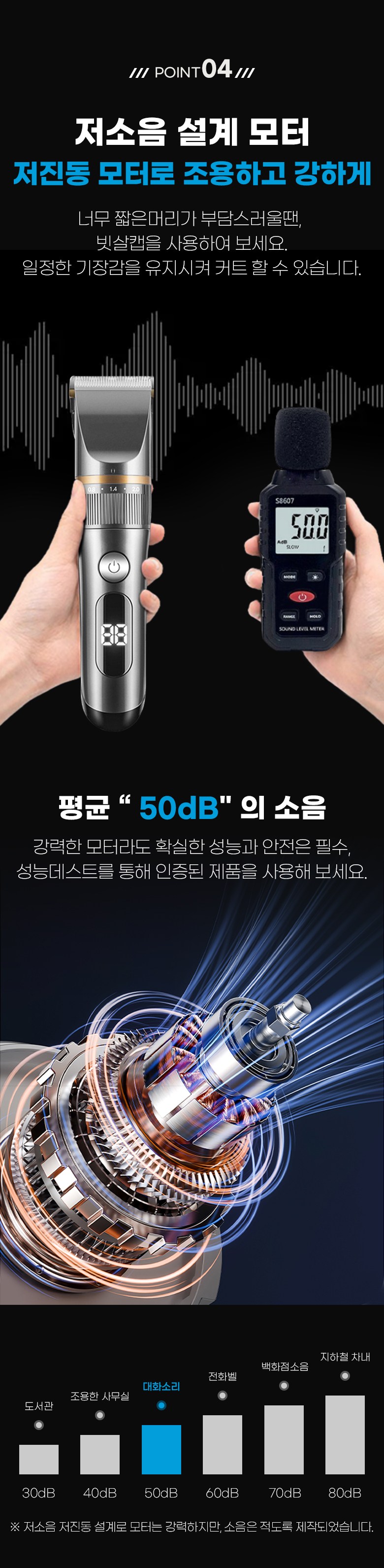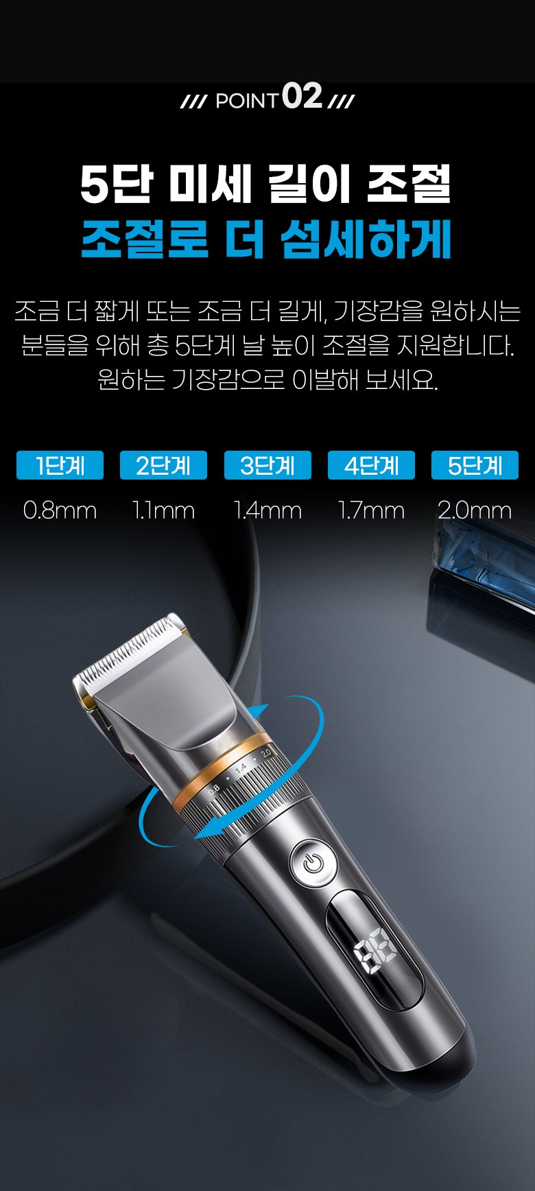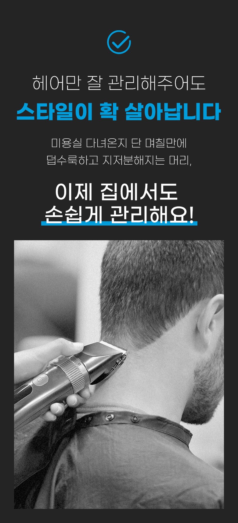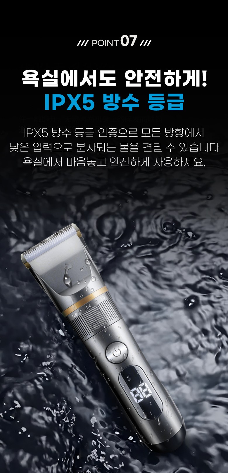 - 구성품: 본체, 미용가운,USB충전연결선, 청소용 솔, 오일, 빗살캡4종,