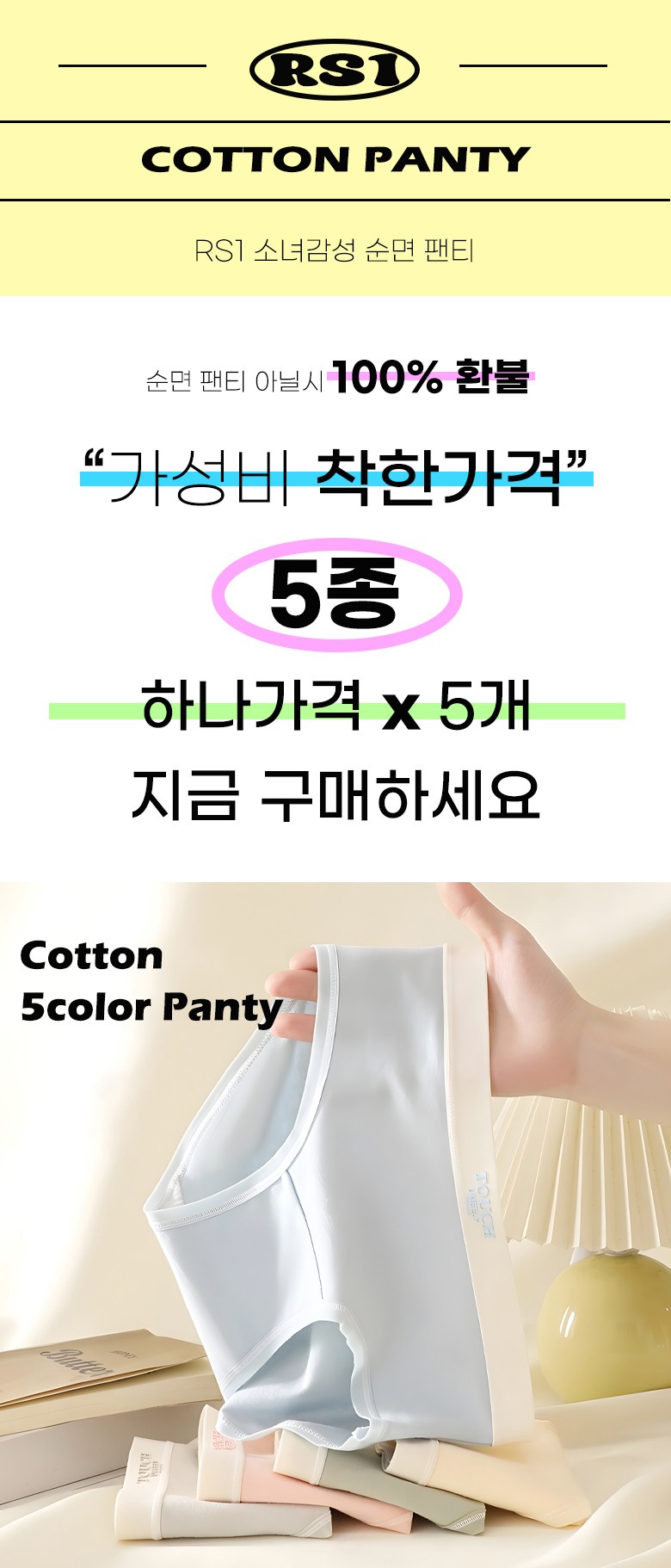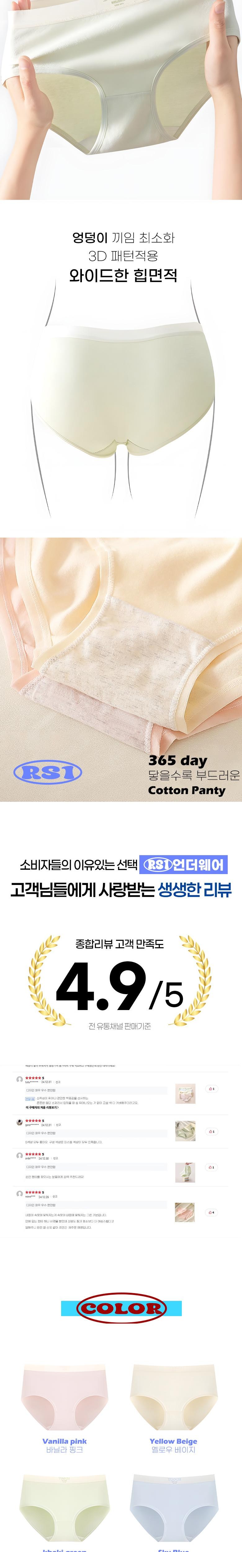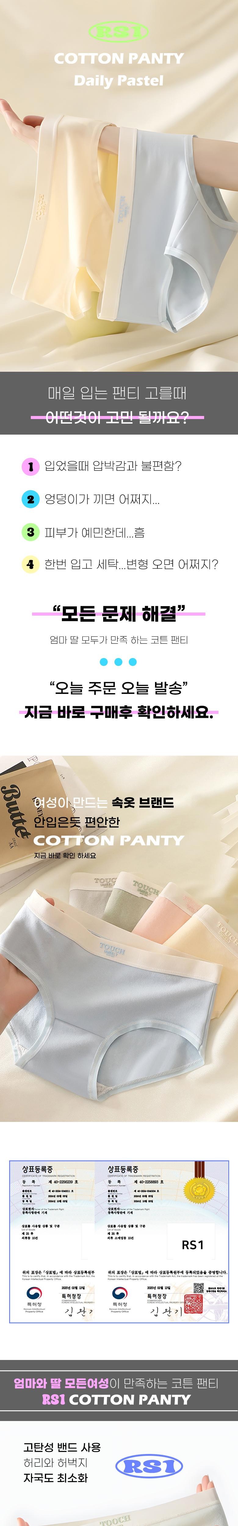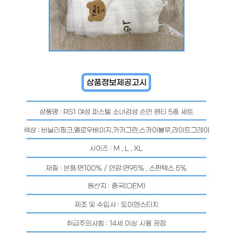 | 종류 | 순면 팬티 5종세트 | 소재 | 본품:순면100% / 안감:면95% , 스판텍스 5% |