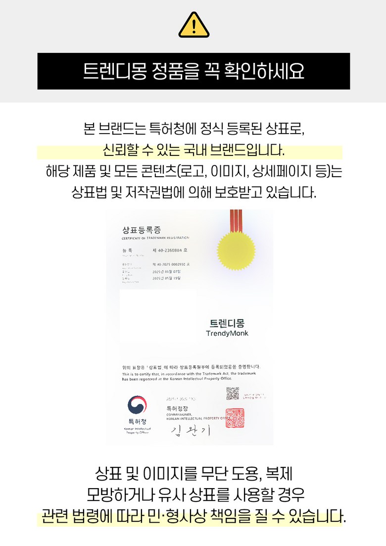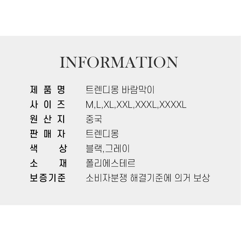 | 치수 | M,L,XL,XXL,XXXL | 제조자(수입자) | 트렝디몽 |