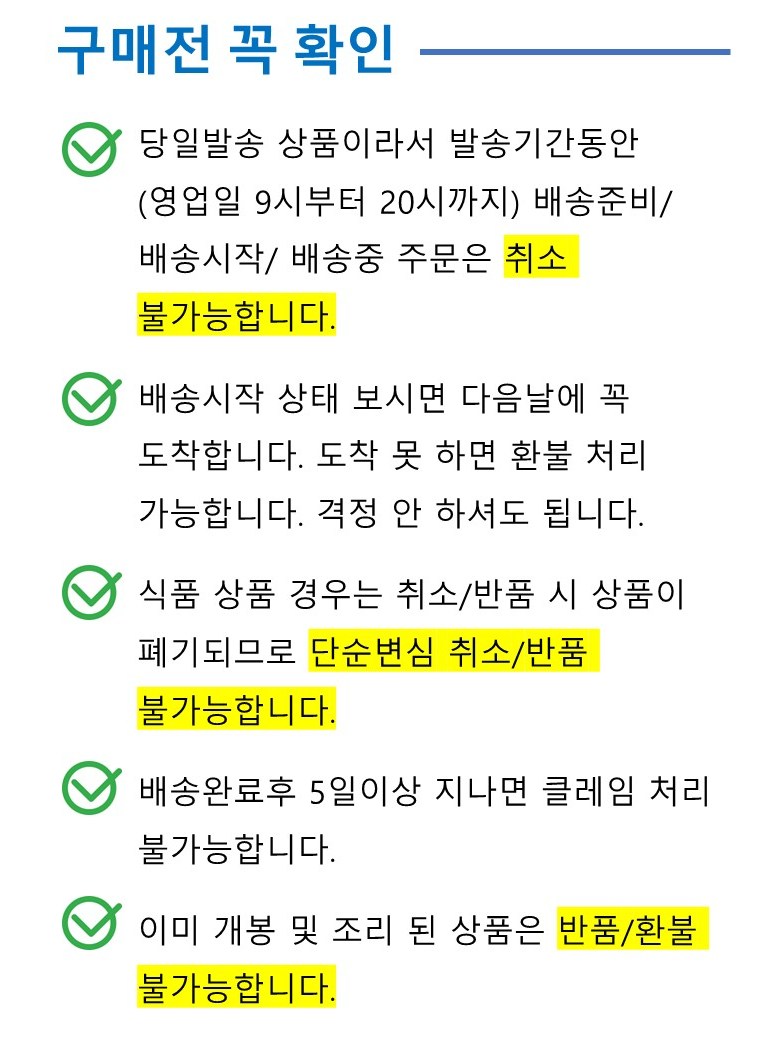 - ㆍ교환/반품에 관한 일반적인 사항은 판매자가 제시사항보다 관계법령이 우선합니다.