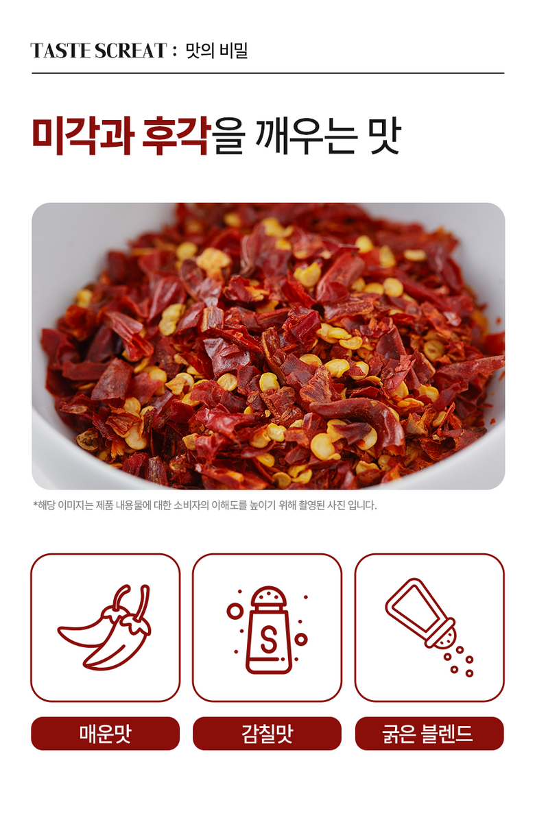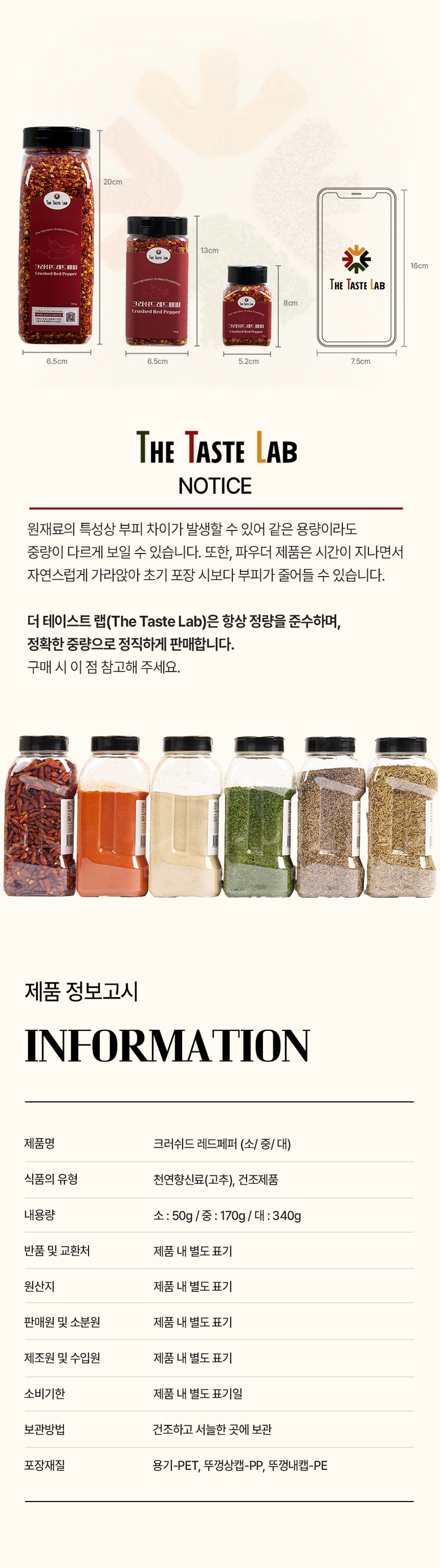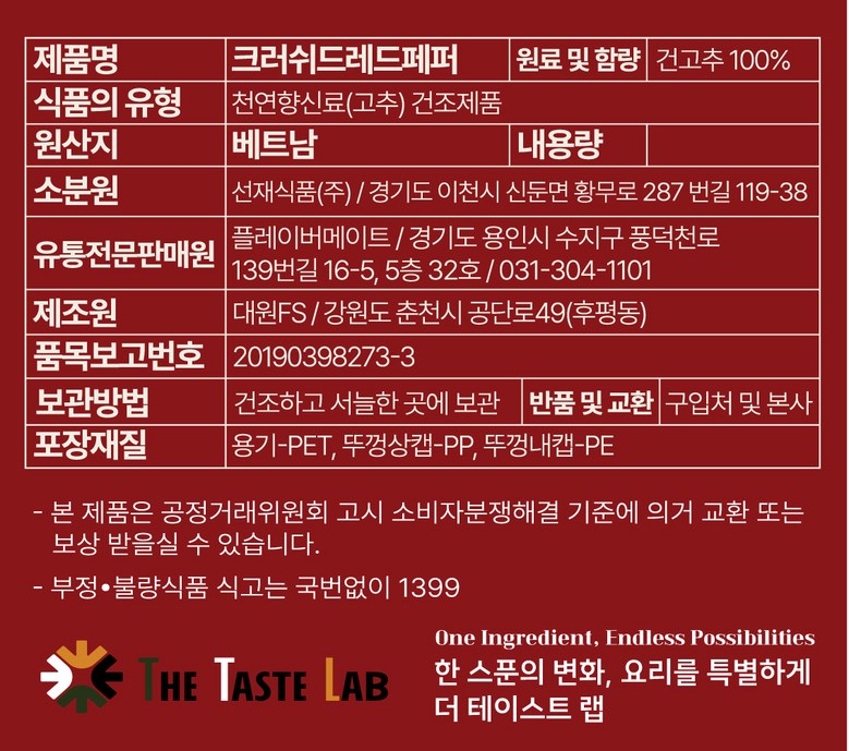 | 품목 또는 명칭 | 더테이스트랩 크러쉬드 레드페퍼 천연향신료 | 포장단위별 내용물의 용량(중량),수량,크기 | 상품 상세페이지 참조 |