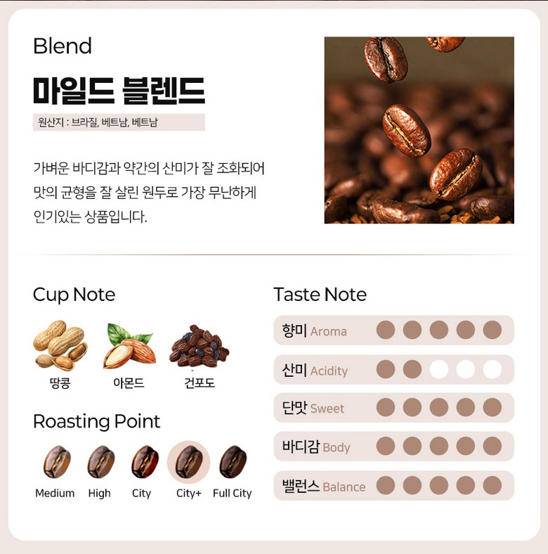 | 제품명 | 마일드 블렌드 | 식품의 유형 | 커피원두 |