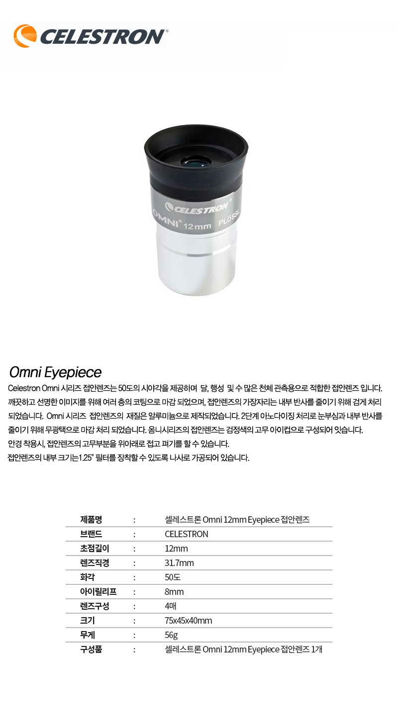 | 품명 및 모델명 | 셀레스트론 Omni 12mm Eyepiece 접안렌즈 | KC 인증정보 | 해당없음(14세이상) |
