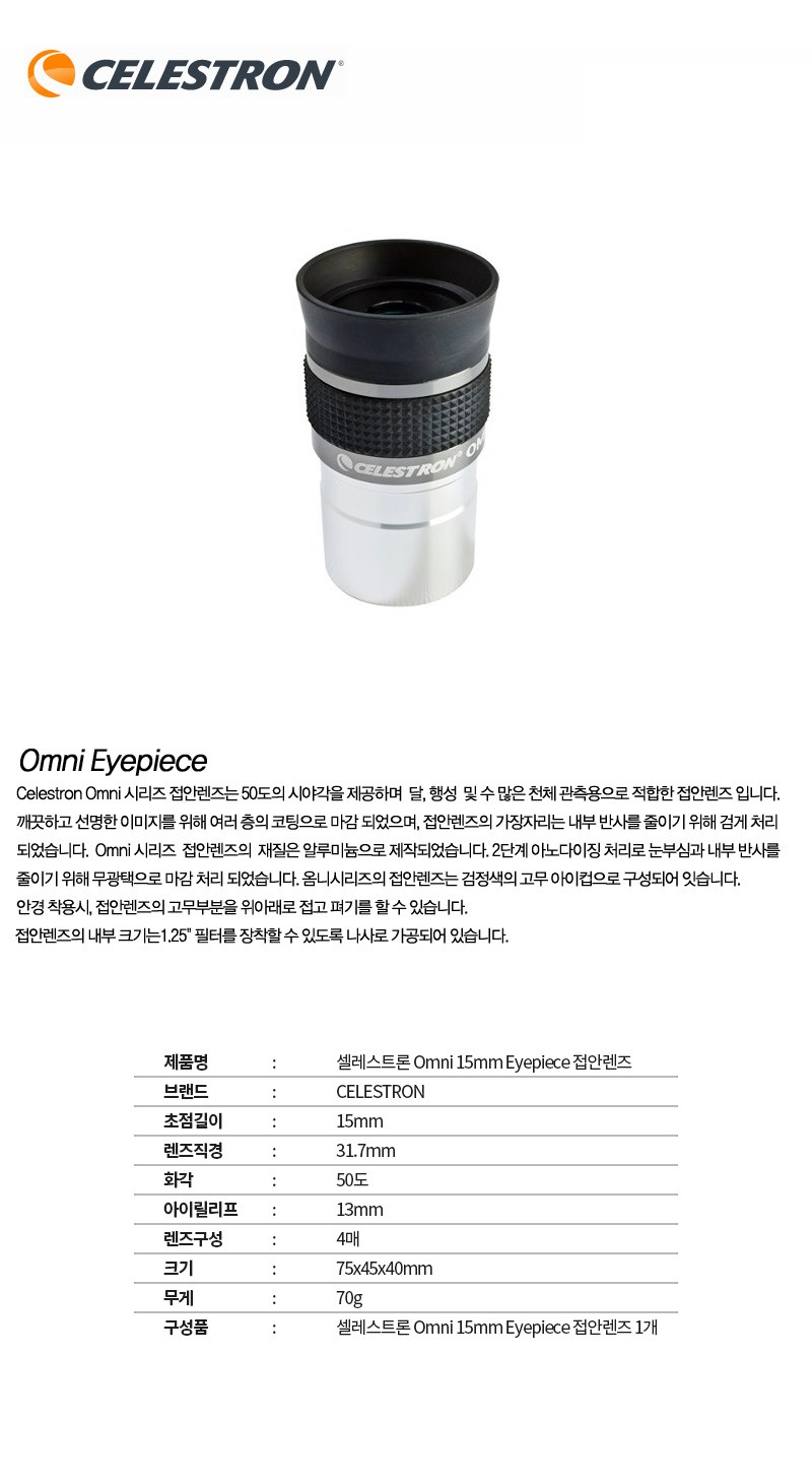 | 품명 및 모델명 | 셀레스트론 Omni 15mm Eyepiece 접안렌즈 | KC 인증정보 | 해당없음(14세이상) |