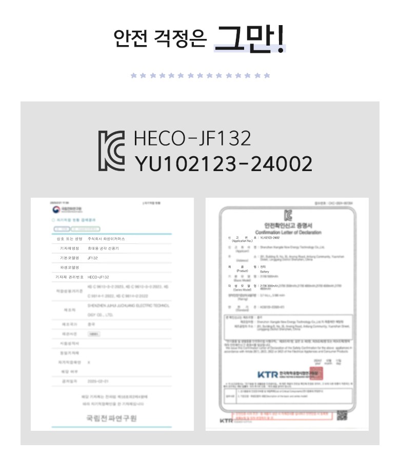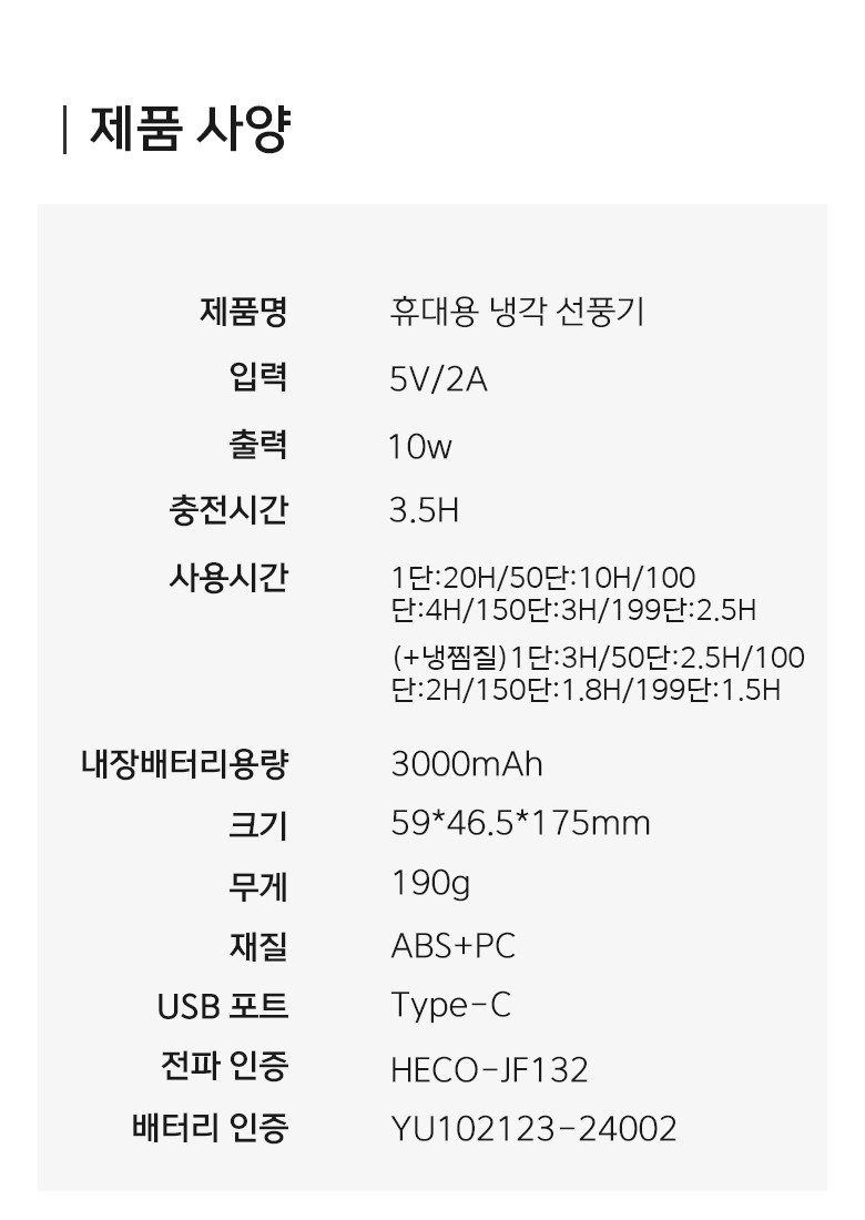 | 품명 및 모델명 | 휴대용 냉각 선풍기JF132 | KC 인증정보 | HECO-JF132YU102123-24002 |