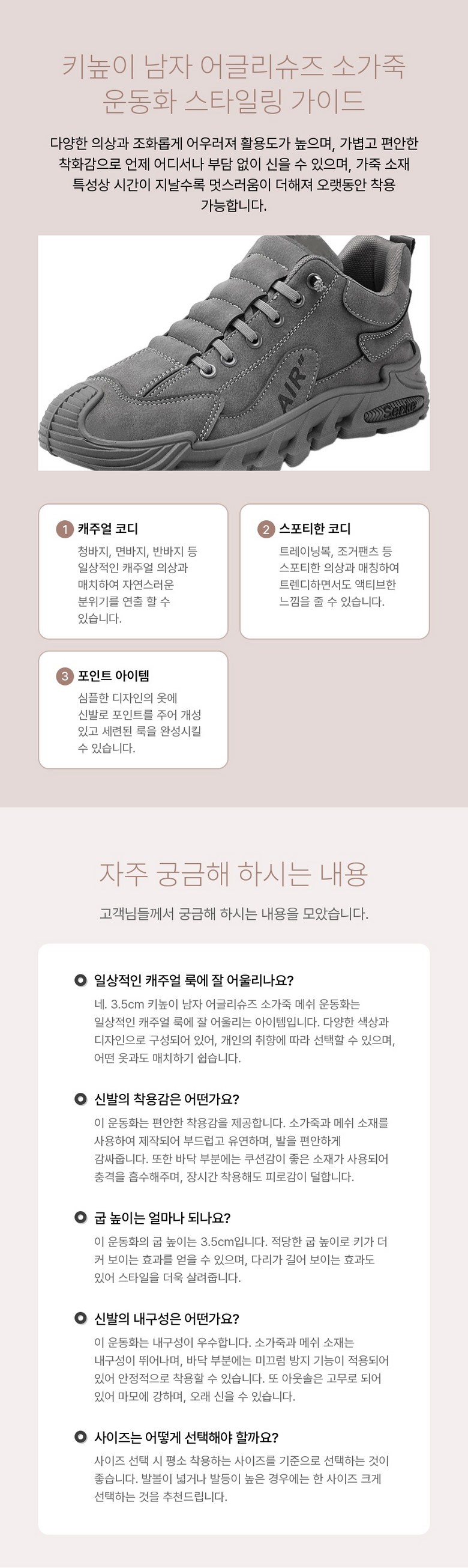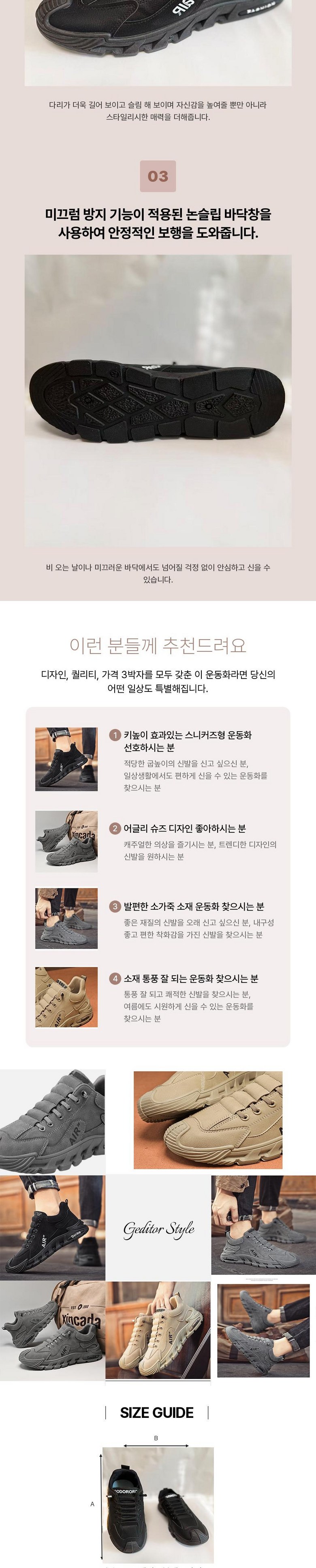 | 제품의 주소재(운동화인 경우에는 겉감,안감을 구분하여 표시) | 남자 키높이 운동화 캐주얼 신발 패션 스니커즈 | 색상 | 그레이,블랙,카키 |
