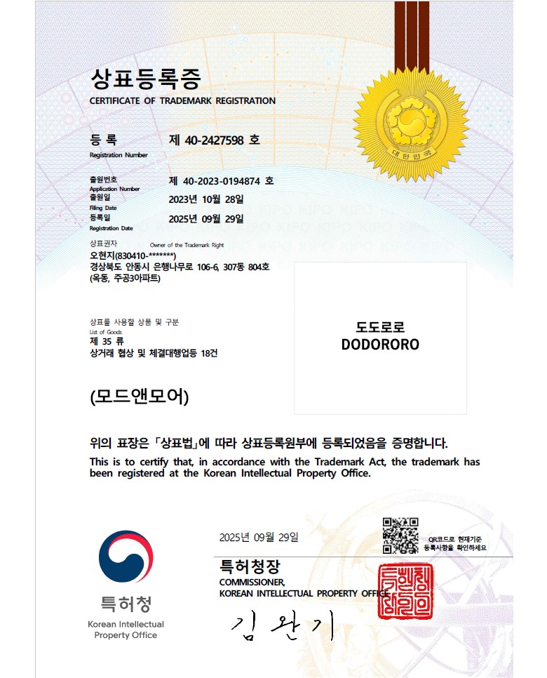 상호/대표자 | 모드앤모어 / 오현지 | 사업장 소재지 | 인천광역시 연수구 용담로 111 6층 6644호 |