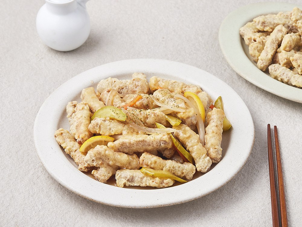 고기에 바삭바삭한 튀김옷을 입히고 새콤달콤한 소스와 함께 즐기는 중화요리, 탕수육. 이제 탕수육을 집에서도 간편하게 즐겨보세요. 잘 달군 기름에 넣고 튀겨주면, 전문점 못지않은 탕수육이 완성됩니다. 한입 베어 물면 쫄깃한 육질 속 고소한 육즙이 입안 가득 퍼져요.