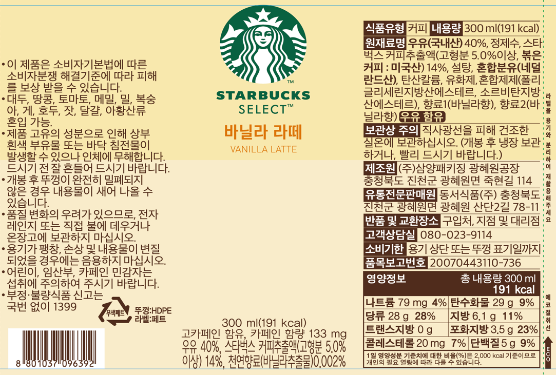 | 제품명 | Starbucks Select 바닐라 라떼 | 식품의 유형 | 컨텐츠 참조 |