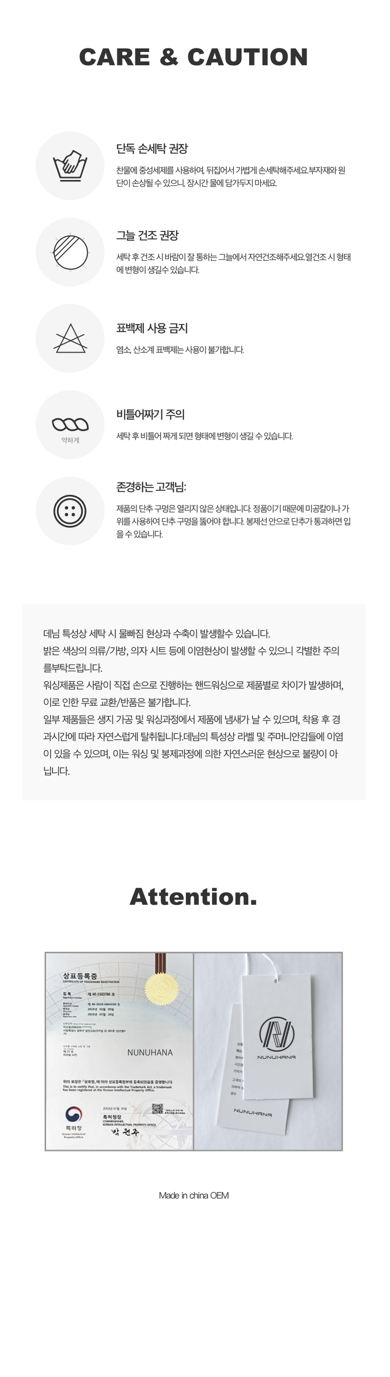 | 제조국 | 중국 OEM | 세탁방법 및 취급시 주의사항 | 상품 상세페이지 참조 |